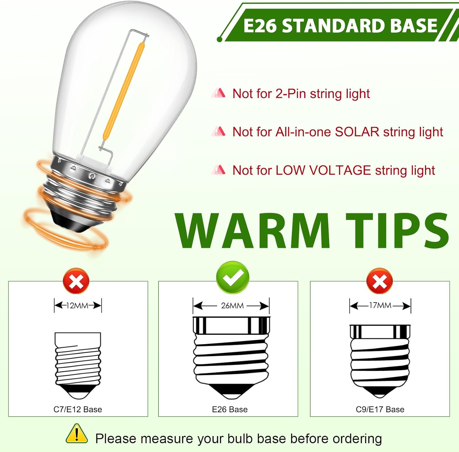 - 【Dimmable Edison Bulb】S14 string light bulbs is perfectly compatible with a wide range of dimmers, the dimmable Edison bulb is the perfect decorative light for gardens, backyards and balconies. Edison LED bulbs are perfect 11w replacement incandescent bulbs for commercial string lights with E26 regular bulb base.