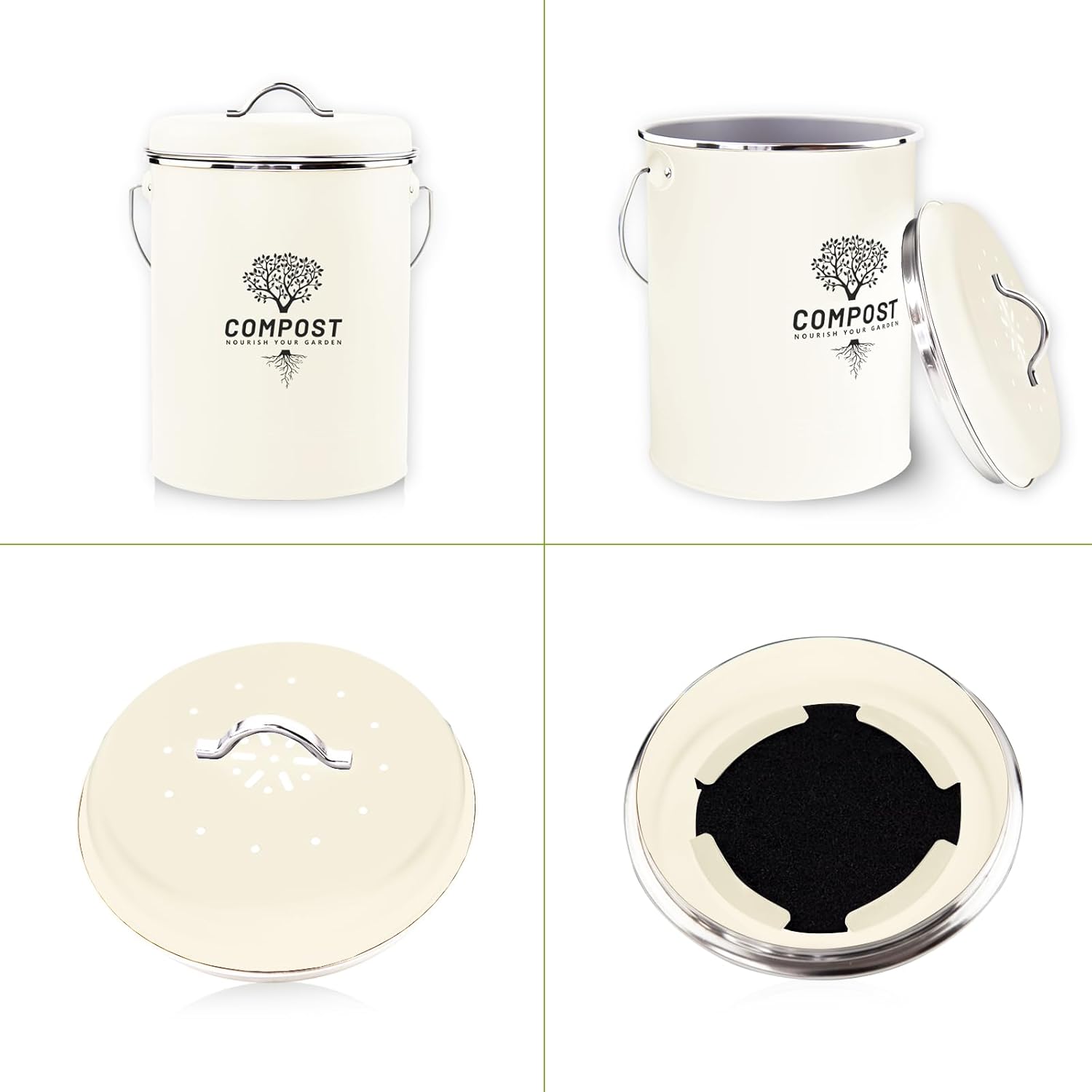 Kitchen Countertop Compost Bin, Odor Resistant Indoor Compost Bin with Lid and Charcoal Filter, Rust Resistant Coated Compost Bucket, Compost Container, Cream