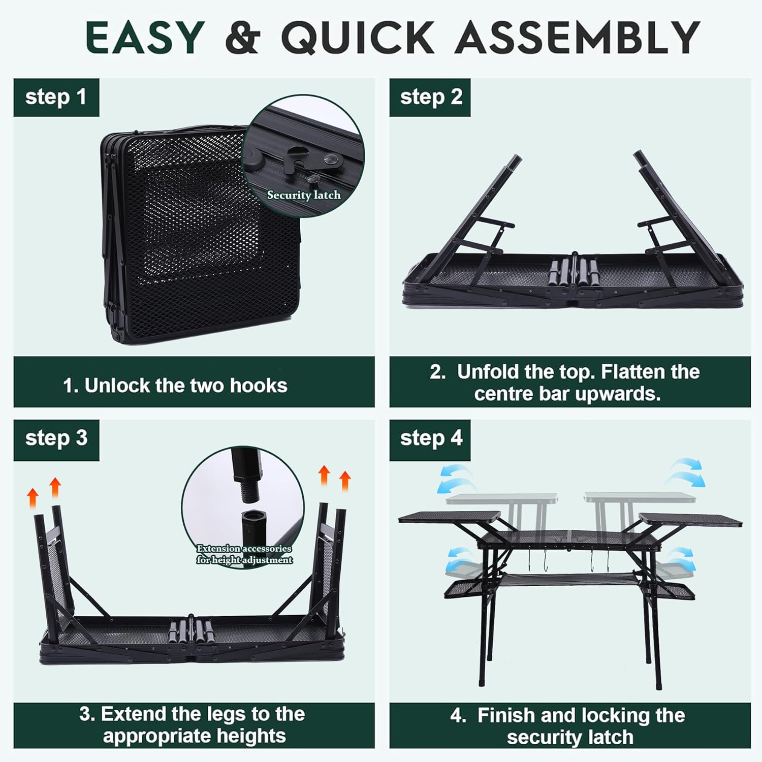 - Ready to Cook: With a robust, heat-resistant power-coated steel design, you can safely use a camp stove on the tabletop. Ideal for various activities like tailgating prep, campsite cooking, picnics, or cleaning up, this multi-use table adapts to all your outdoor needs.