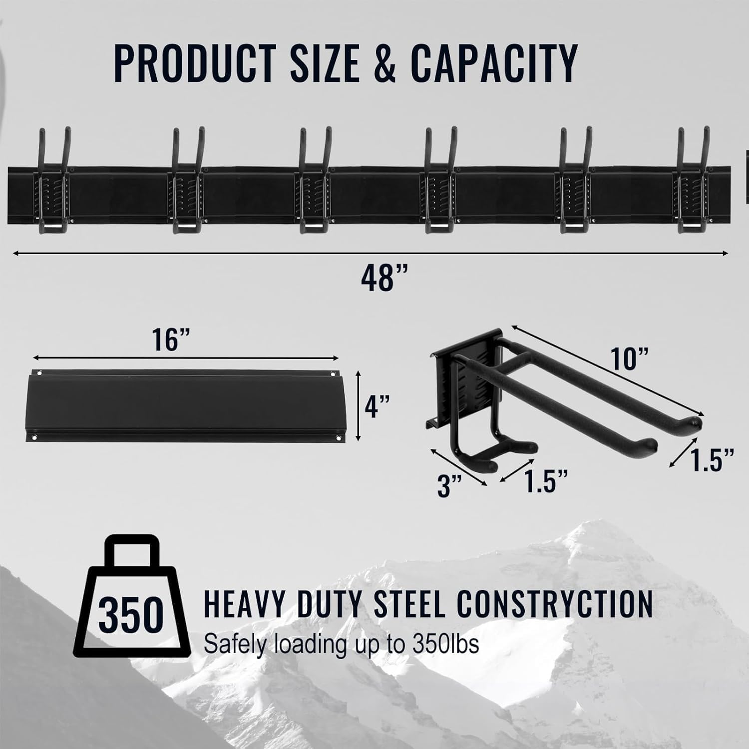 - EASY TO RELOCATER & ADJUSTABLE: The Garage Storage system with 6pcs Steel wall racks (16 inch), 12pcs Double Hooks (10 inch), Garage hooks can be easily repositioned anywhere on tracks of the panel when storage needs change. And fast wall-mount hooks can install in a snap.