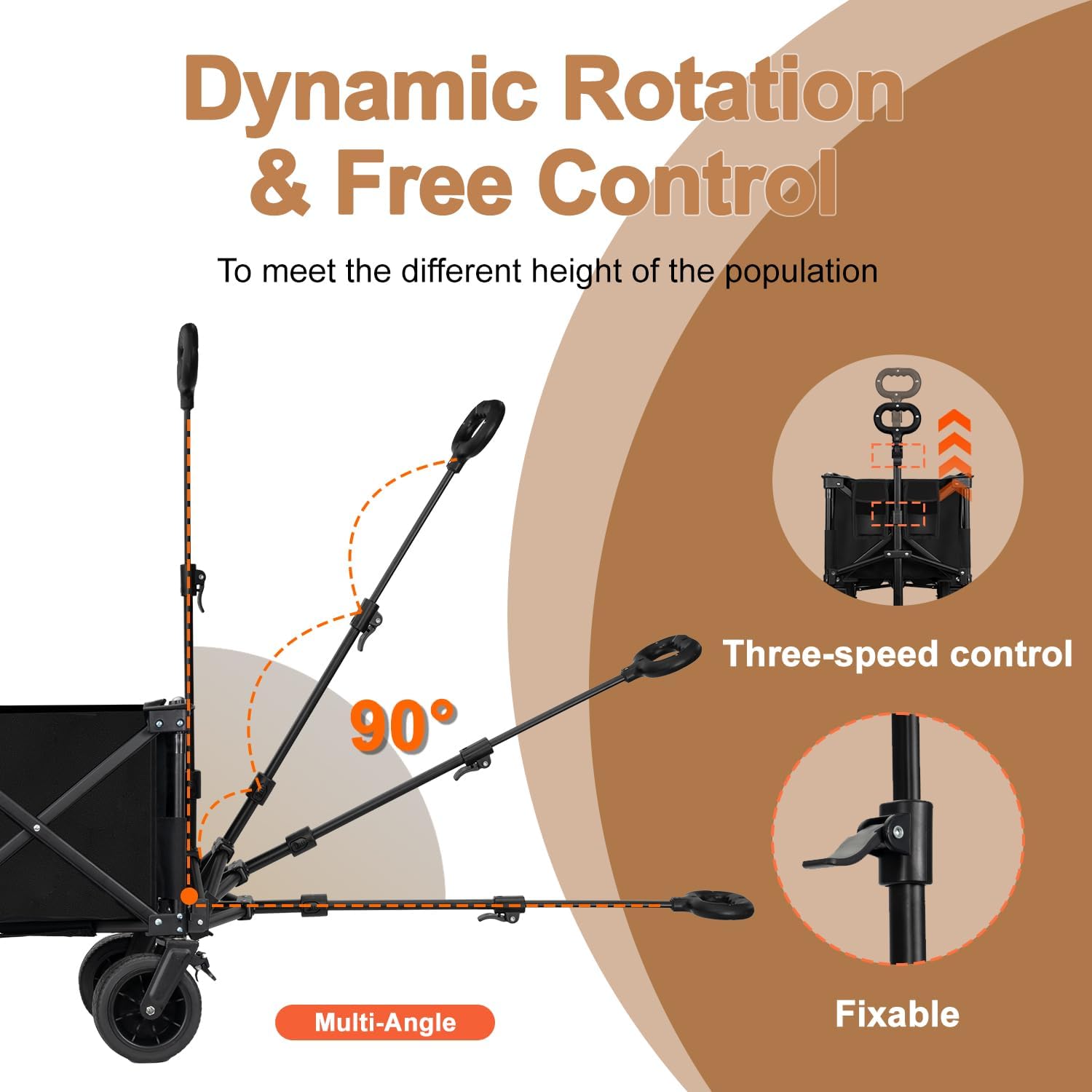 - Folding Wagon Cart-Flexible Maneuverability: The portable wagon is equipped with 360ยฐswivel wheels and brakes for stability on slopes, You can go wherever you want to go, no matter how difficult the terrain is. The telescoping handle can be adjusted at any Angle, Accommodates people of different sizes, Even if your child wants to pull it, it's very easy
