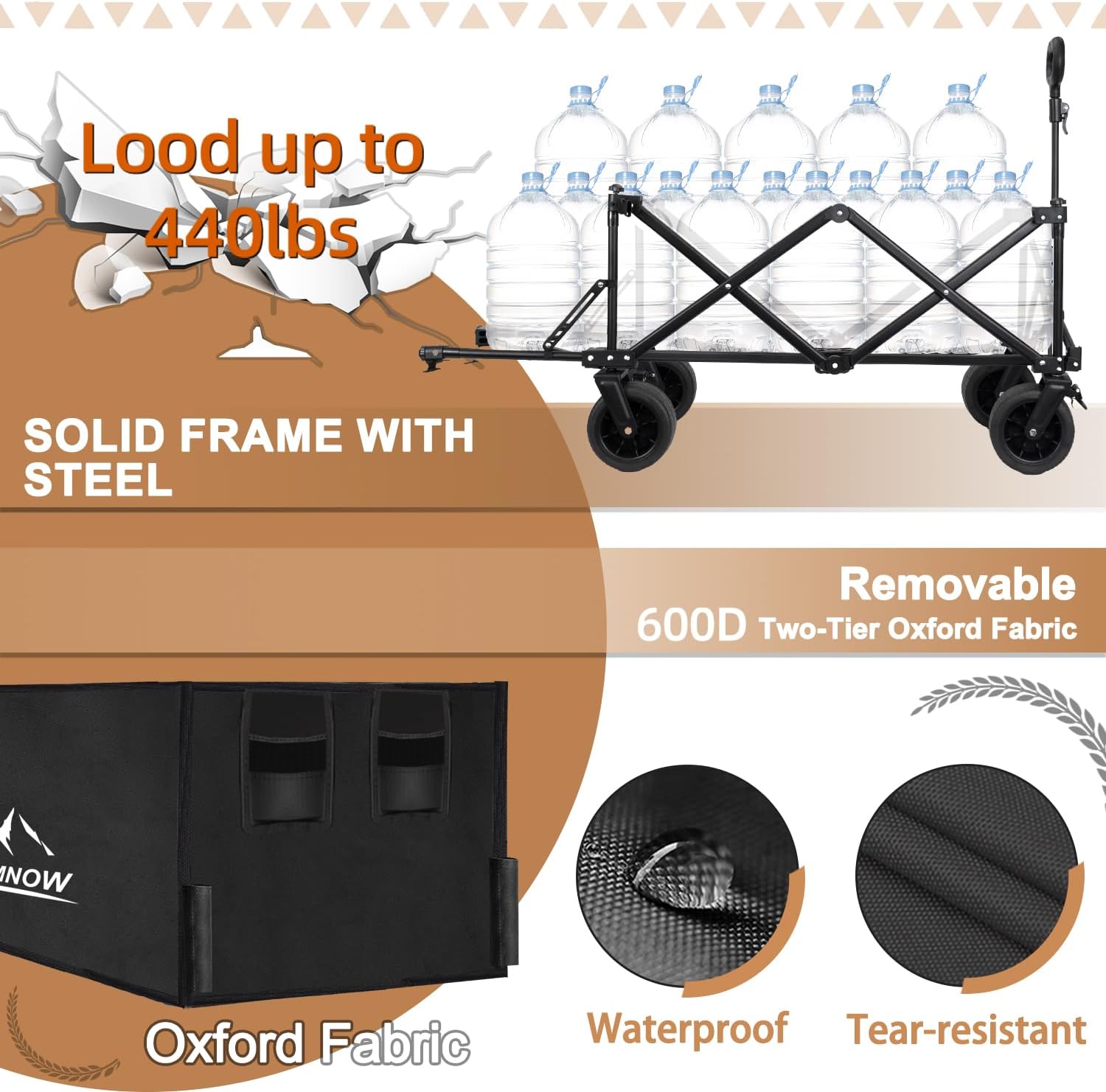 Collapsible Beach Wagon Cart with Big Wheels, 440LBS Upgrade Large Capacity Folding Wagon, Foldable Grocery Cart with Side Pocket and Brakes, Ideal for Sand Camping Outdoor Garden Sports, Black