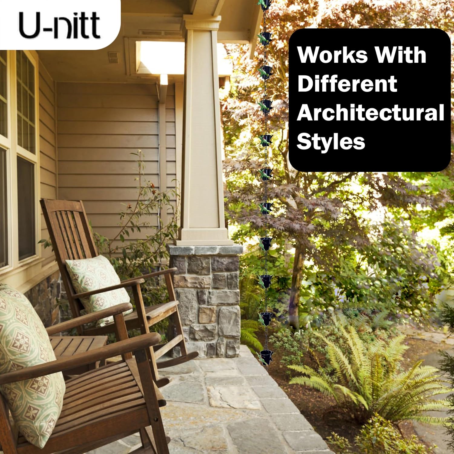 - SUPERIOR CRAFTSMANSHIP - is evident in every detail of this expertly designed U-nitt rain chain. Meticulously crafted from premium, heavy-duty materials, it offers both durability and elegance. Each link or cup is precision-shaped to ensure smooth water flow, effectively guiding rainwater from your gutter in a graceful cascade. Rust-resistant and built to last, this rain chain blends functionality with artistry, adding a refined touch to your homeโs exterior while enhancing rainwater management.