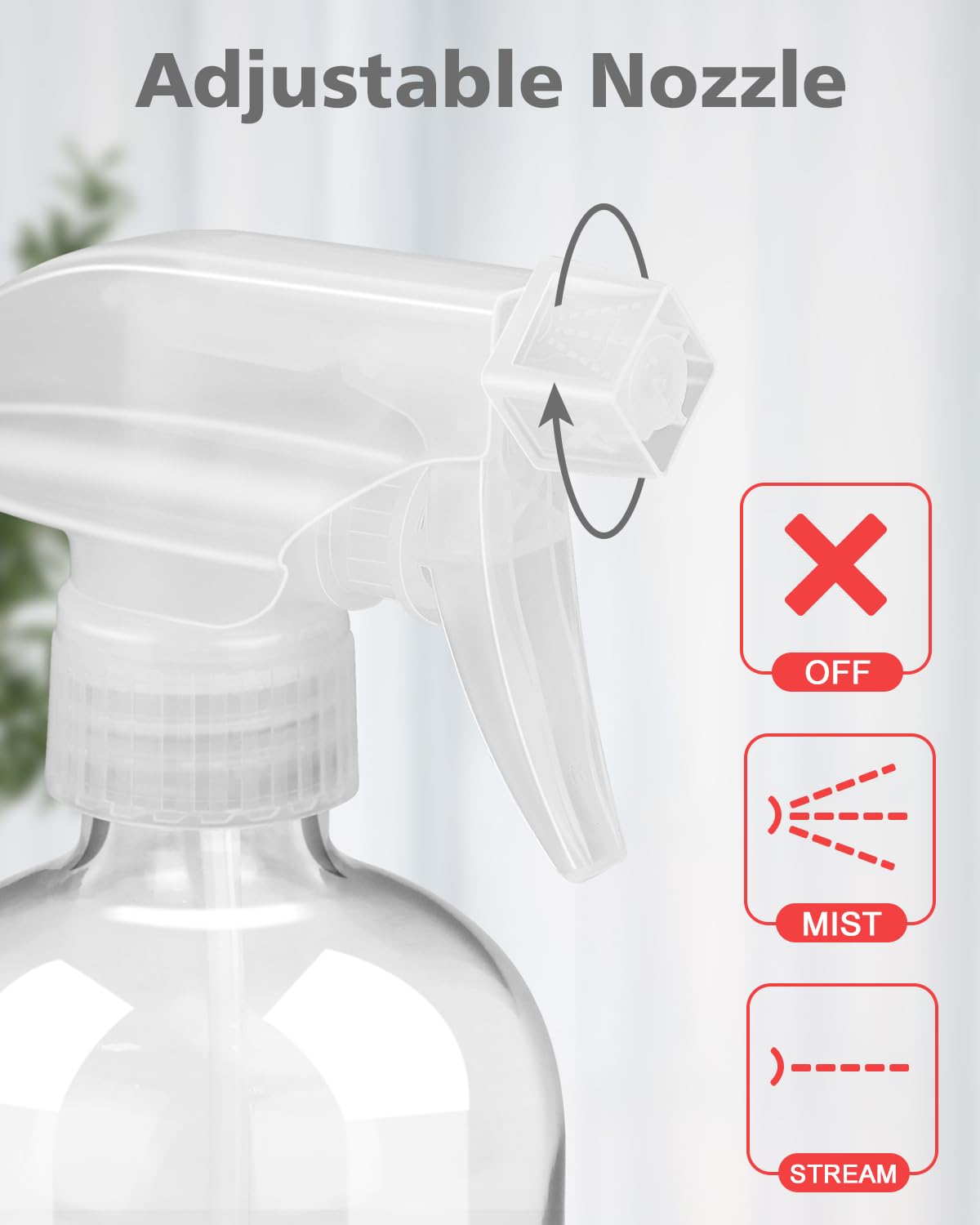 - Adjustable Nozzle: The spray nozzle has three adjustment state: mist, stream and off. It has a large atomization area and also can spray uniform in a small area. The multifunctional use method of glass spray bottles increase its efficiency. Meet your needs for use in different environments.