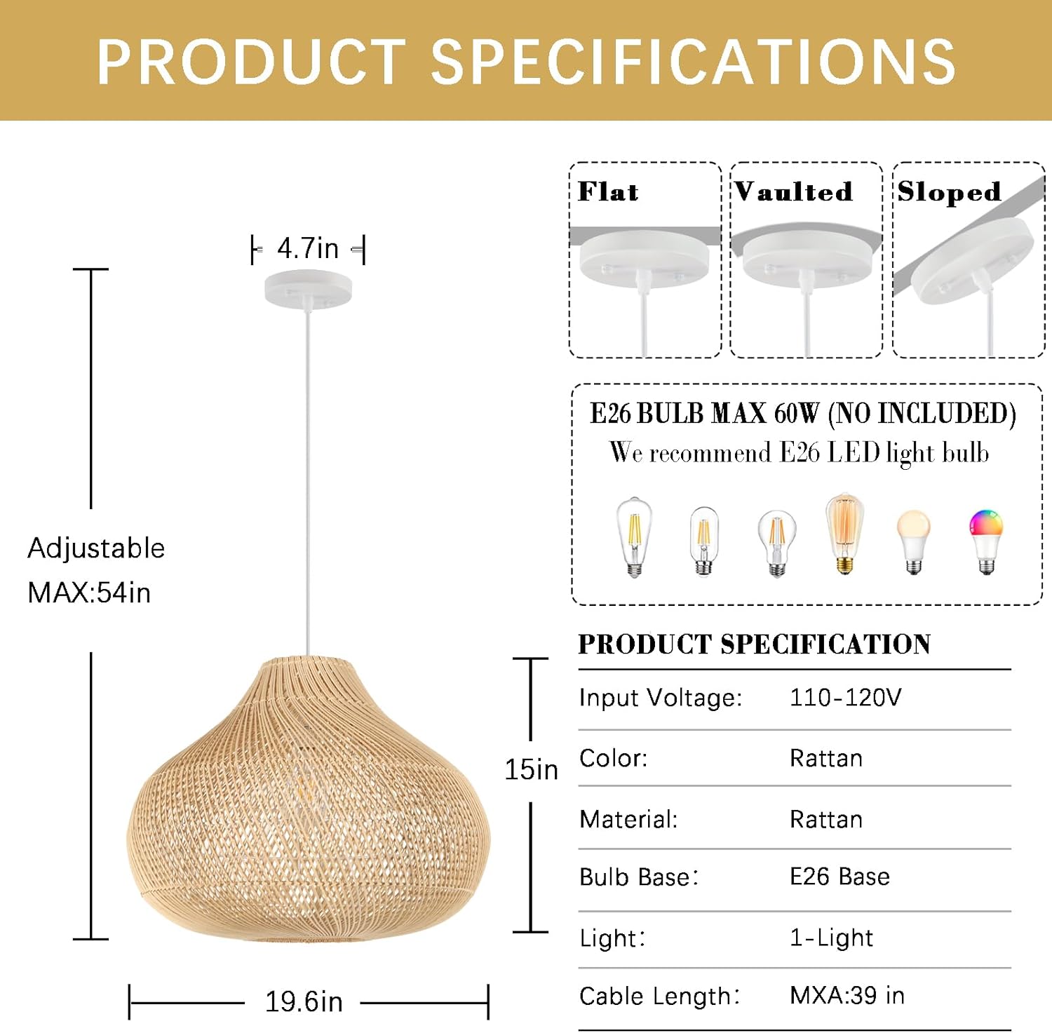 - 【Bulb Requirements & Dimmable】This boho pendant light use standard E26 lamp base, Max 60W. This pendant light fixture is compatible with all kinds of E26 bulbs. It can be dimmed when using dimmable bulbs and dimmable switches (Bulb and Switch Not Included).