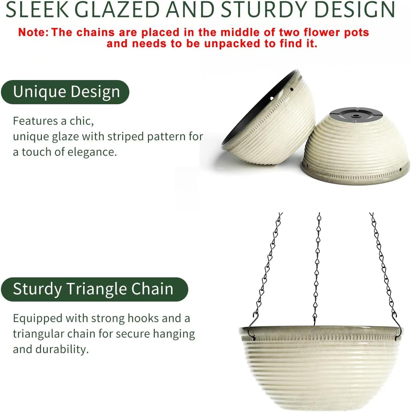- Strong Triangular Chain: Super load-bearing triangulated chain with three rust-resistant chain and hook, this hanging pots for plants indoor increased stability for easy hanging. The chain can also be removed, allowing the hanging planter pots to be placed on a tabletop.