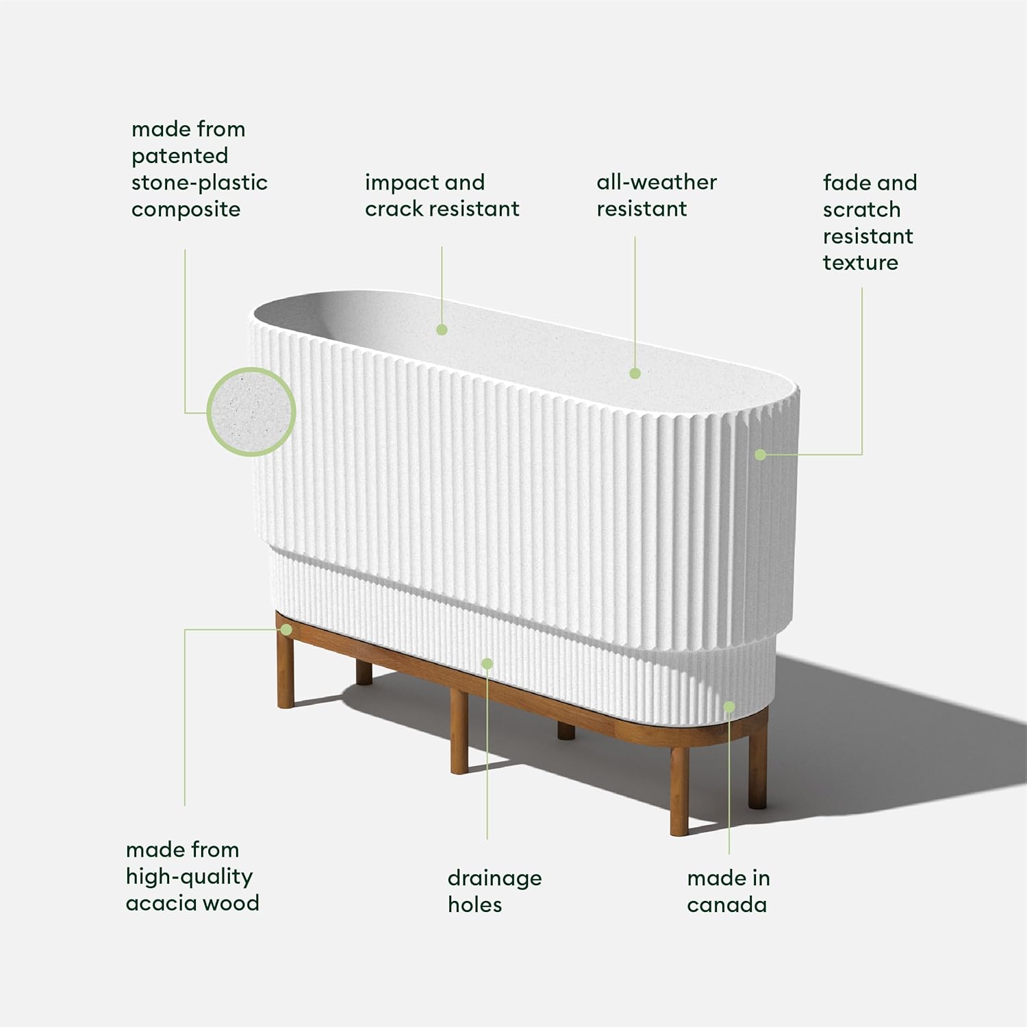 - DURABLE MATERIAL: Made from a patented plastic-stone composite, this fluted planter has a subtle textured finish and is all-weather resistant to cracks, scratches, UV and fading; perfect for hot or cold climates ranging from -20 to +120 degrees