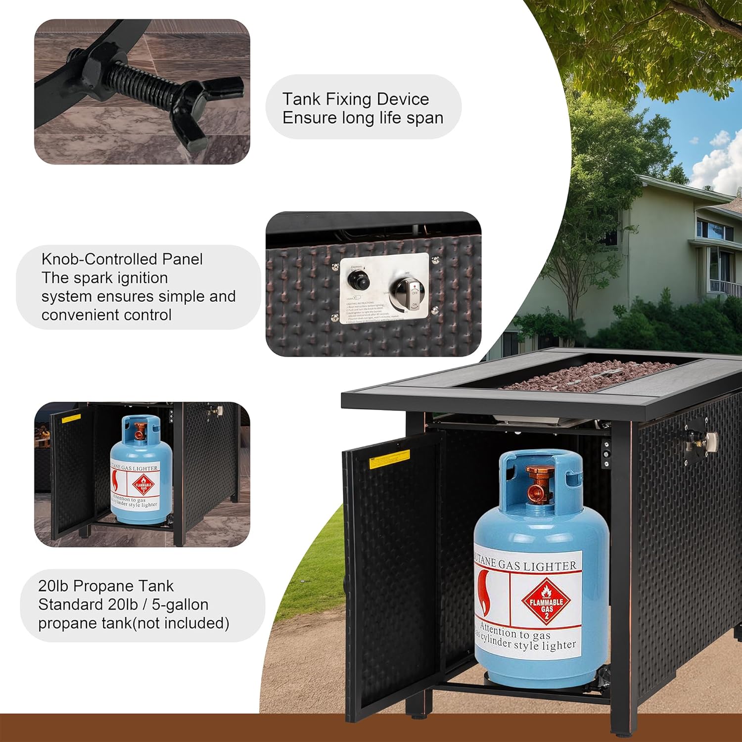 - What Includes: Built with solid steel, the table is ready for long last using. We provide with some Lava Rock which will reflect beautiful firelight, a lid for your multiple use, a waterproof cover for storage and water-resistant use. Please note that the tank is not include.