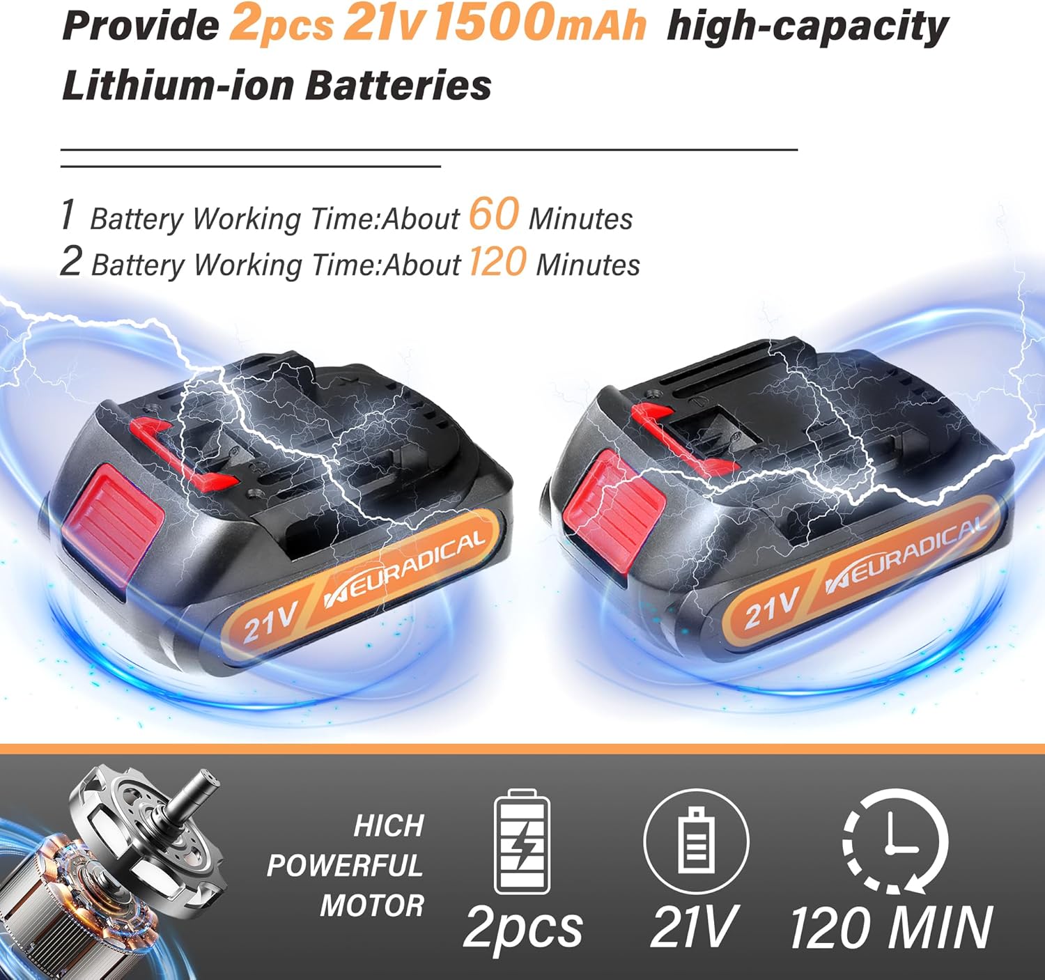 - 【Provides 2 PCS 21V 1500mAh Rechargeable & Detachable Batteries】 Neuradical battery powered hedge trimmer comes with 2 pieces of 21V 1500mAh high-capacity rechargeable & detachable lithium-ion batteries, so you don’t have to worry about running out of power. When one of the batteries is depleted, you can switch to the other spare battery. The total runtime of these two batteries is approximately 120 minutes.