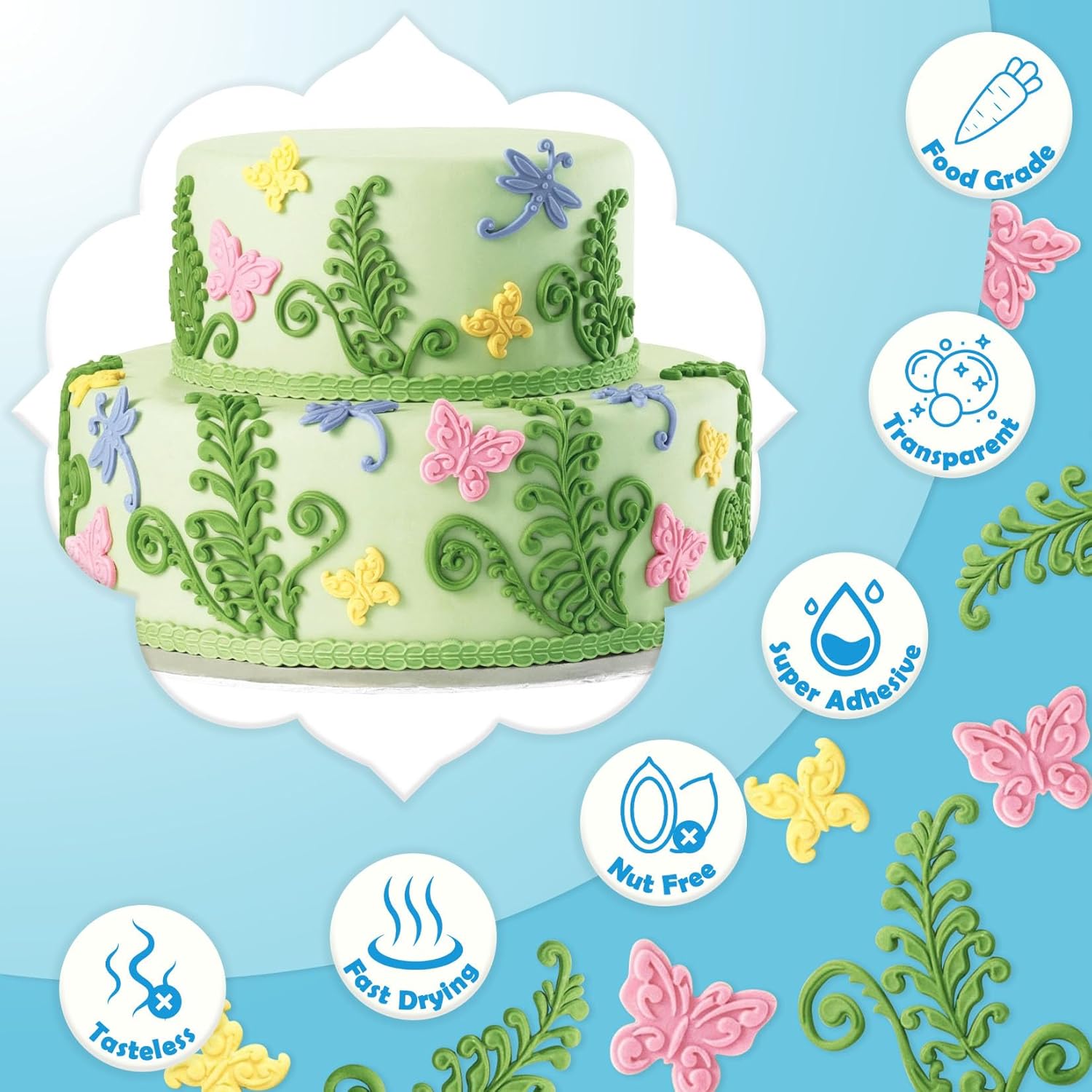 - Food Grade Safety - Our edible Glue for cake decorating is made from high-quality food-grade ingredients, ensuring the highest level of safety and quality for your culinary projects. The edible flowers adhesive has not dyes or additives, tasteless, transparent, and will not alter the flavor of your food.