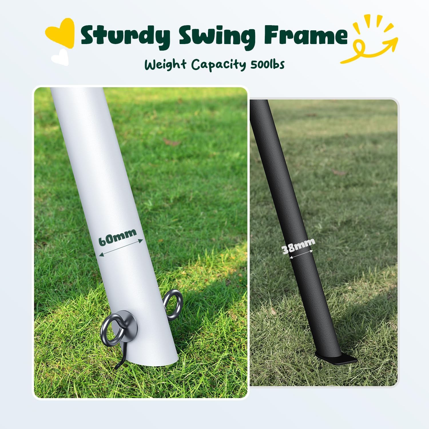 - 【Heavy Duty Outdoor Playset】Hapfan's kids' swingset features a robust A-frame design and durable 60mm-diameter metal poles for enhanced stability. The outdoor swing set can support up to 500lbs, ensuring safety for all users