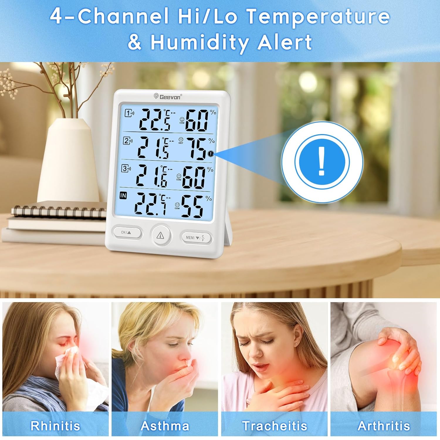 Geevon Indoor Outdoor Thermometer Wireless, 5-Inch Display Digital Hygrometer Thermometer Temperature Humidity Monitor with 3 Remote Sensors and Backlight, Battery-Powered(White)