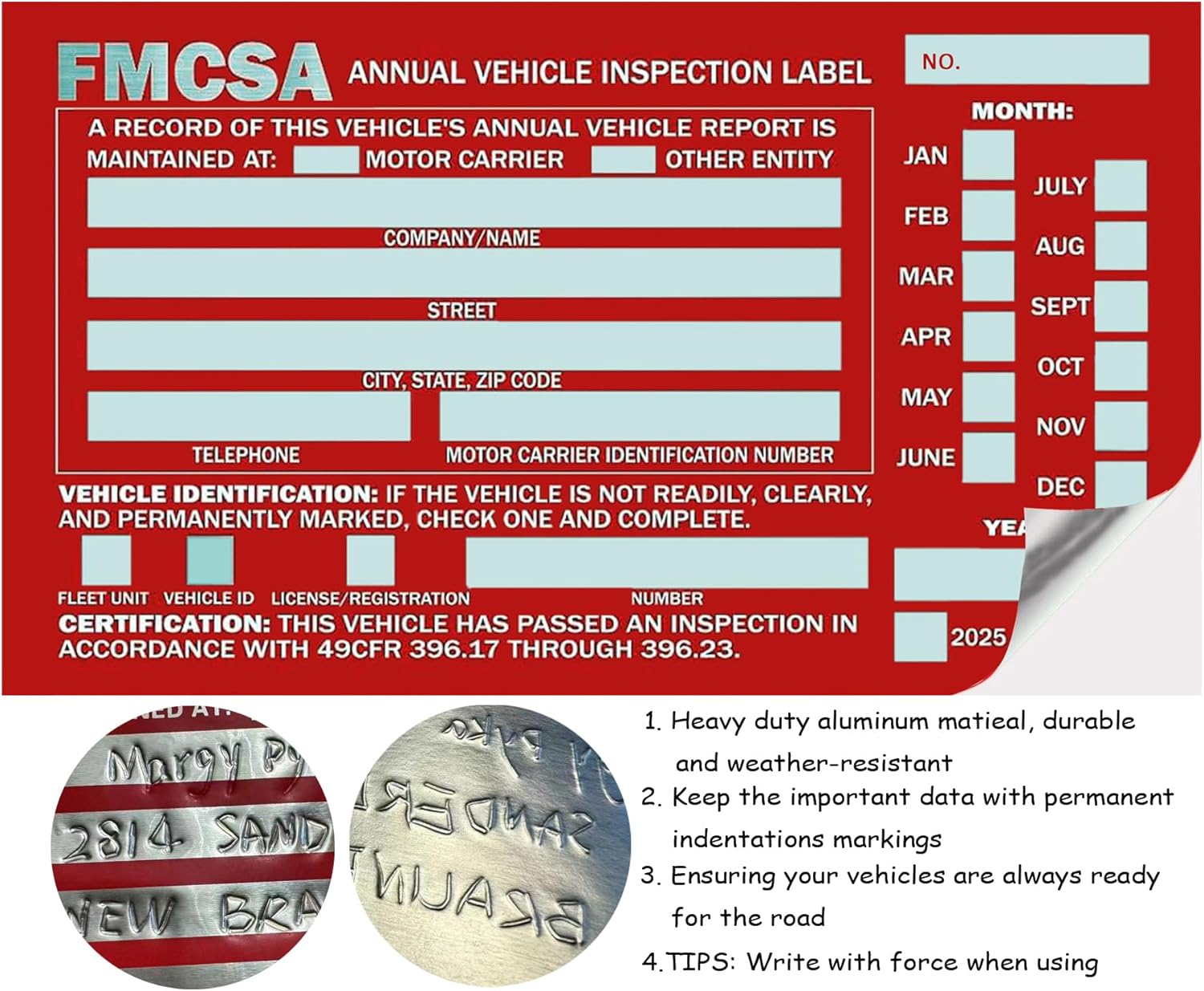 - Label Durability: The vehicle inspection labels are made of 1.6 mil aluminum with a permanent adhesive, featuring permanent indentations to ensure markings do not fade due to sunlight or washing, and the label displays a three-year date range, including the current year and the next two years. Plus, its sheer tensile strength is tear and puncture-resistant, protecting the annual inspection label and ensuring writing is legible and safe for future reference.