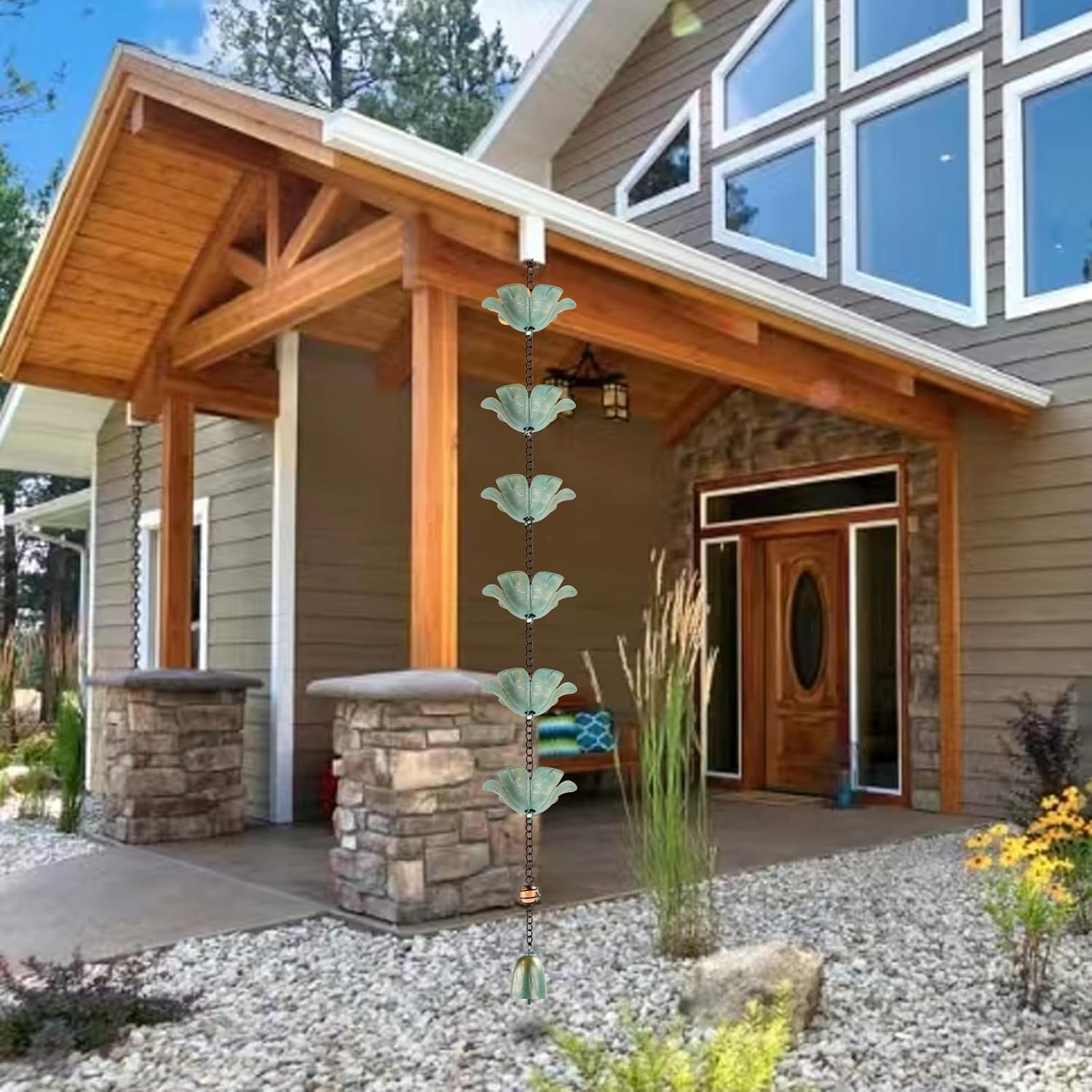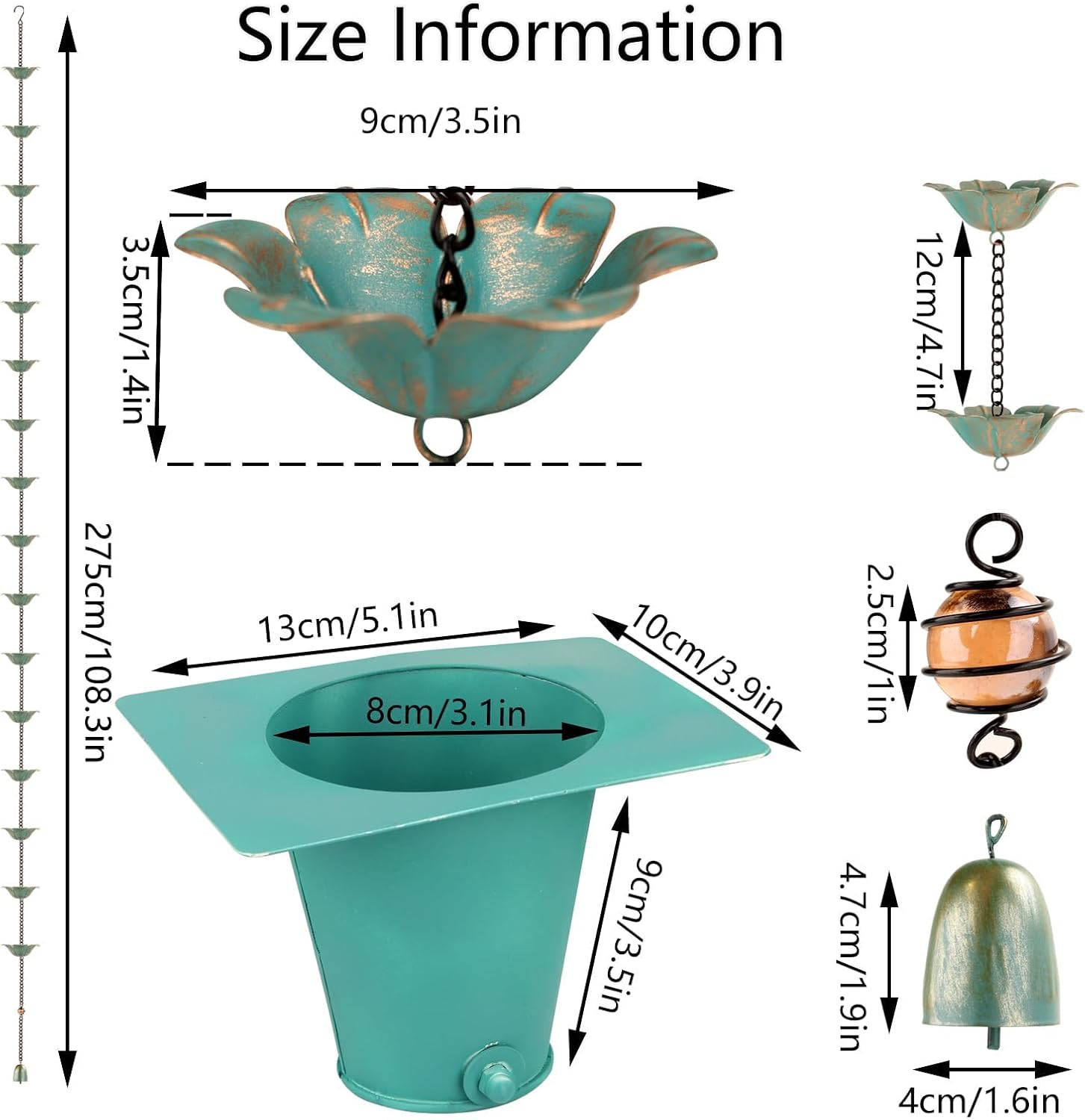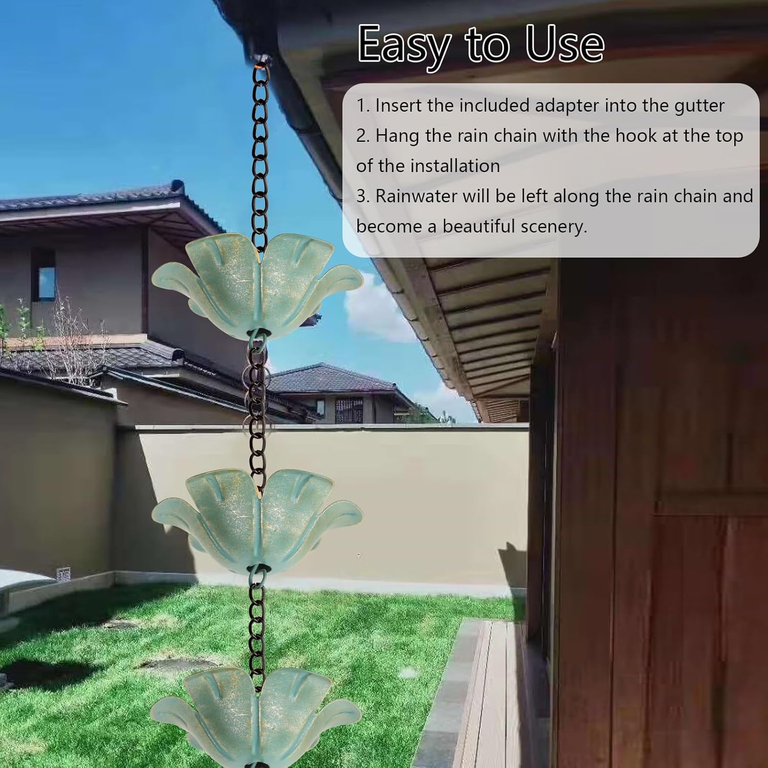 - Multi-functional :Our rain chain can not only effectively replace the traditional downpipe to help guide rainwater to the designated area, which contributes to the rational use of water resources, but can also be used as a decorative item to enhance the aesthetics of the balcony or the environment outside the house. Whether it is hung on the patio, balcony, or porch, it can become a bright landscape.