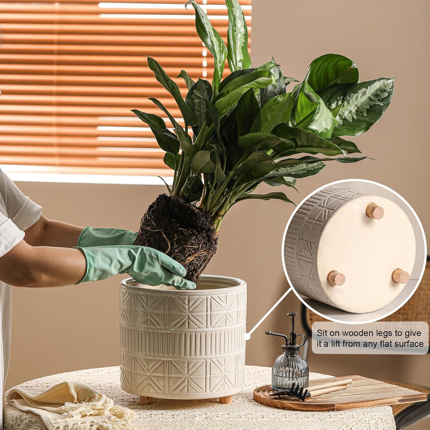 - STYLISH DESIGNED PLANTER: Our cylindrical plant pot, featuring refined geometric engravings and a sleek minimalist design, suitable for modern, farmhouse or mid-century home styles; The planter sit on wooden legs to give it a lift from any flat surface