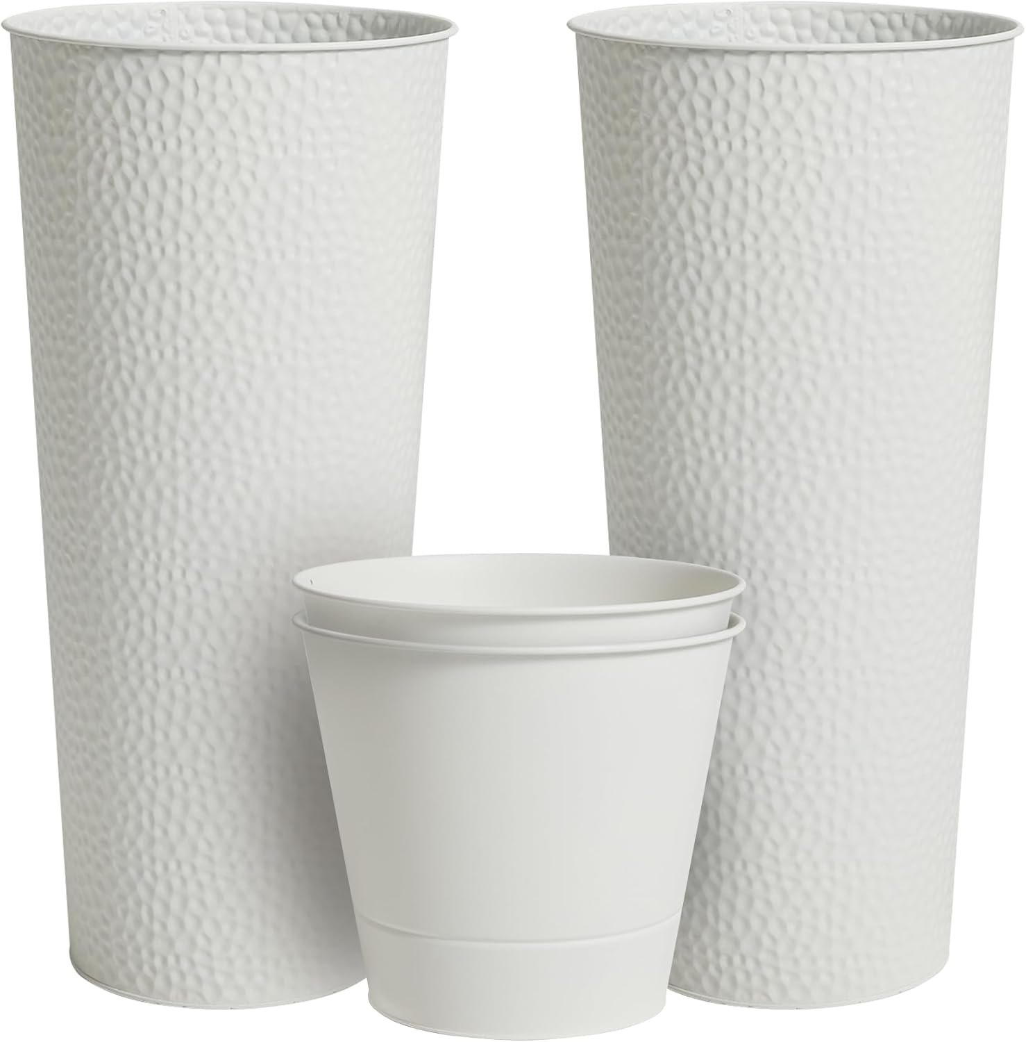Worth Garden 2-Pack 28" H. Metal Planter with 2X Inside Pots - Hand-Hammered Texture Tall Cone Plant Pots - Large Handcrafted Flower Pot for Indoor Outdoor, Deck, Patio, Front Porch - White
