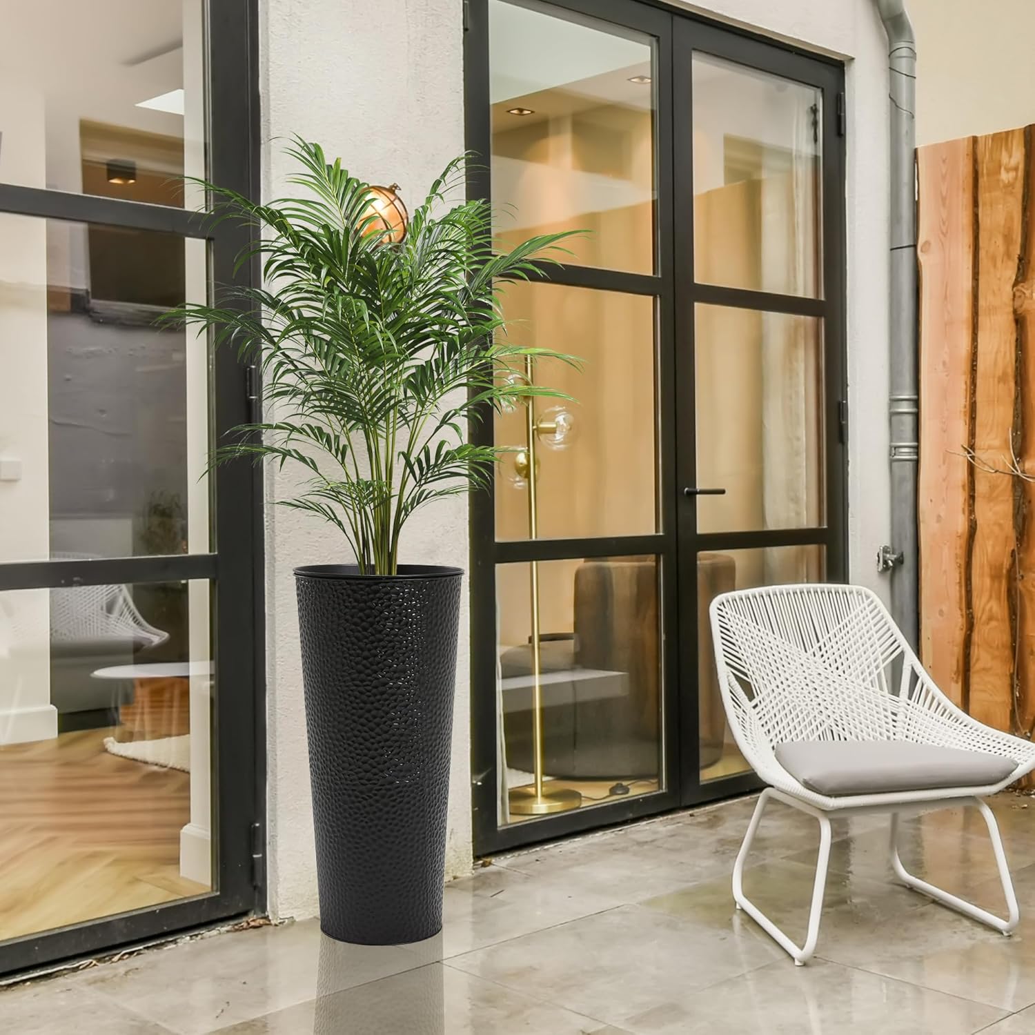 - Lightweight and Durable: These 25" high planters are made of high-quality metal, ensuring their longevity and resistance to outdoor elements. They are lightweight and you can lift them easily. Each outer planter weighs only 4.5lb, insert pot weighs 2lb. Also, the insert can be easily removed with the plant in it for easy mobility. For outdoor use, we recommend using a stone stabilized base.