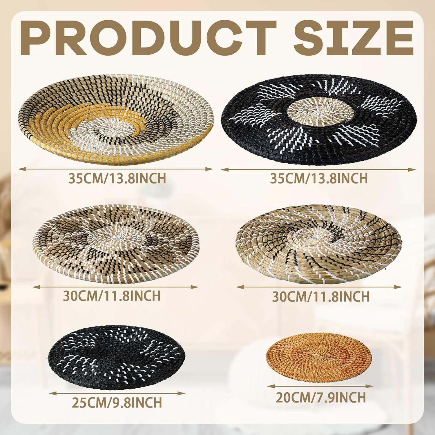 - Abundant to Choose: you will receive 8 pieces of woven wall baskets in different styles, the sizes vary from 7 inch to 11.8 inch, suitable for wall decorating use, the quantity and sizes are enough for your daily needs and replacement demands, you can mix and match them as you need, making your furnishing styles more attractive