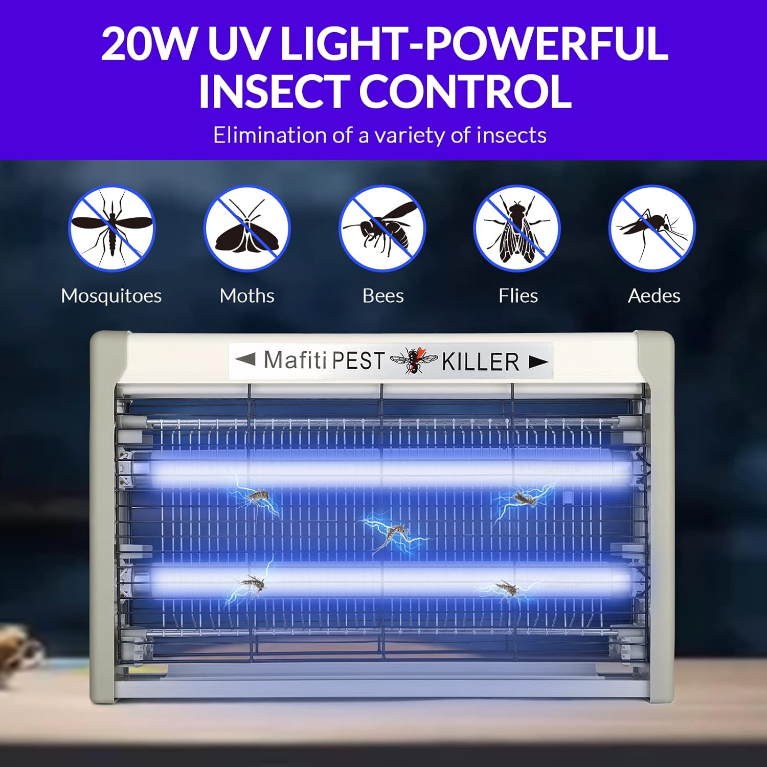 - 【 Effective Bug Zapper Indoor 】 This fly trap attracts mosquito, flies, moths, wasp, gnats, beetle and other flying insects using two UV light bulbs. They are trapped and electrocuted in the electrically-charged high voltage metal grids. With 20W UV bulb ,this mosquito killer lamp can kill flying insects in 583 sq ft ! One mosquito and fly killer traps is enough for your house! Easy, Efficient,Eco-friendly!