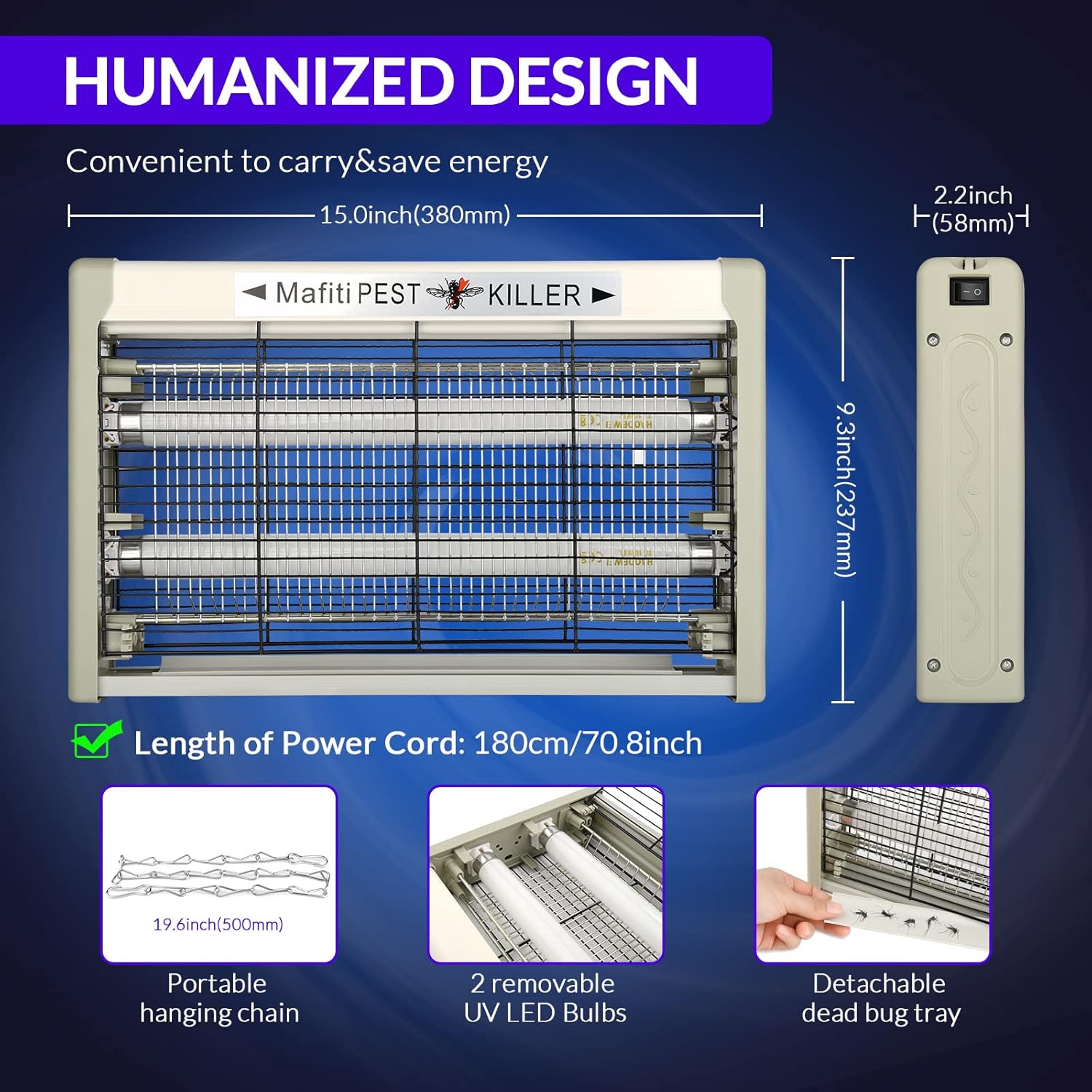 - 【 Easy to clean 】 The removable metal tray at the bottom of the unit collects dead insect, and is washable to make maintenance fast and simple.