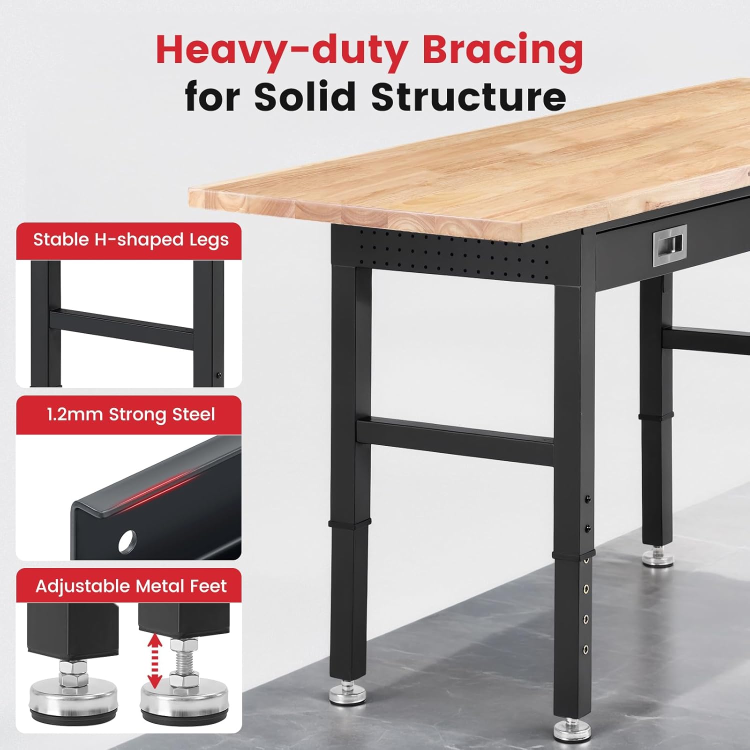 Work Bench with Drawers Adjustable Workbenches for Garage 60 Inch Rubber Wood Top Garage Workbench with Pegboard,Power Outlets for Woodworking, Home, Office, Workshop