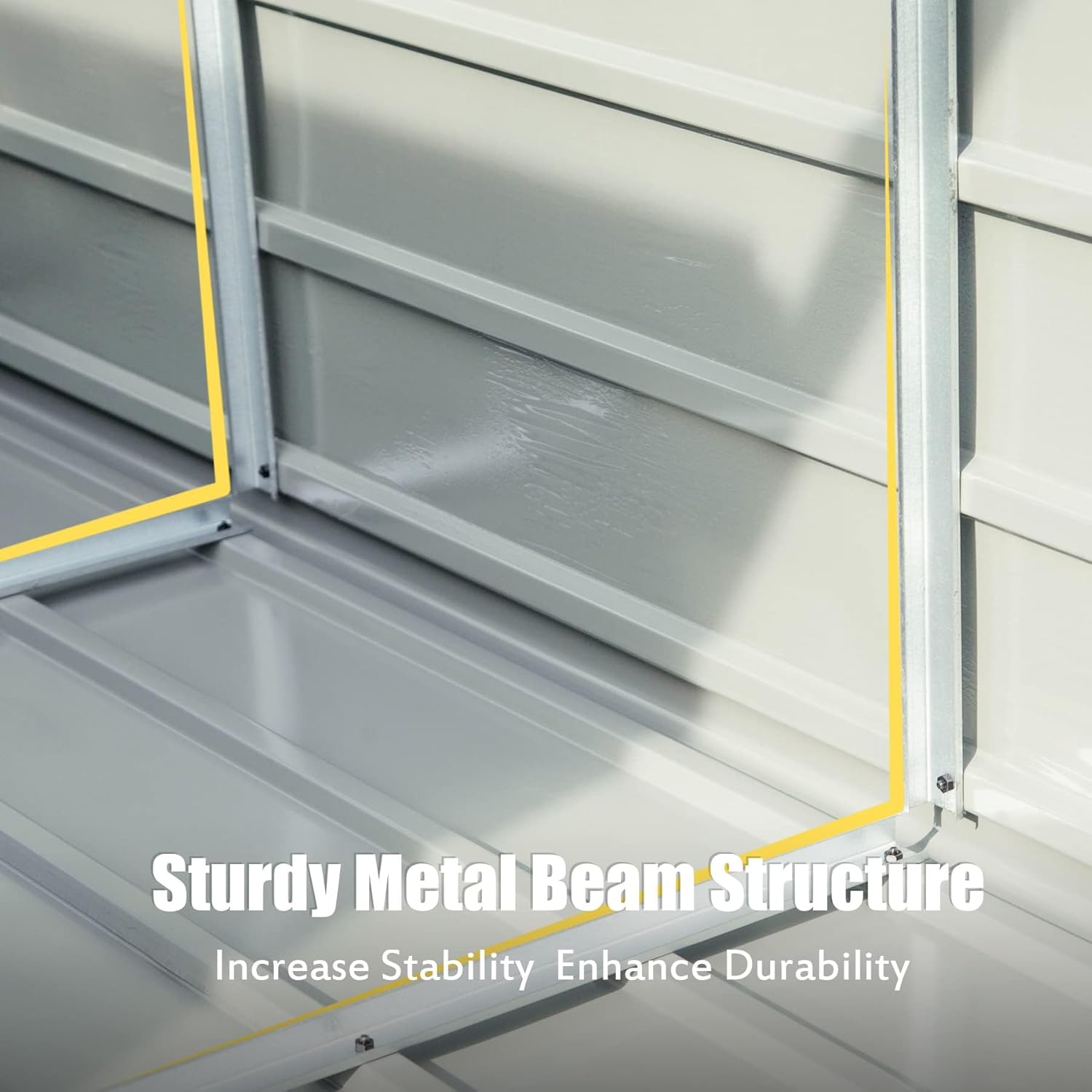 - [DURABLE STURDY CONSTRUCTION]: This storage shed adopts thicker galvanized steel frame and the roof is supported by sturdy metal beam structure, which are rust proof, waterproof and maintain the ability to resist bad weather for many years, dedicated to outdoor use. The column and the top are thickened to increase the stability and durability.