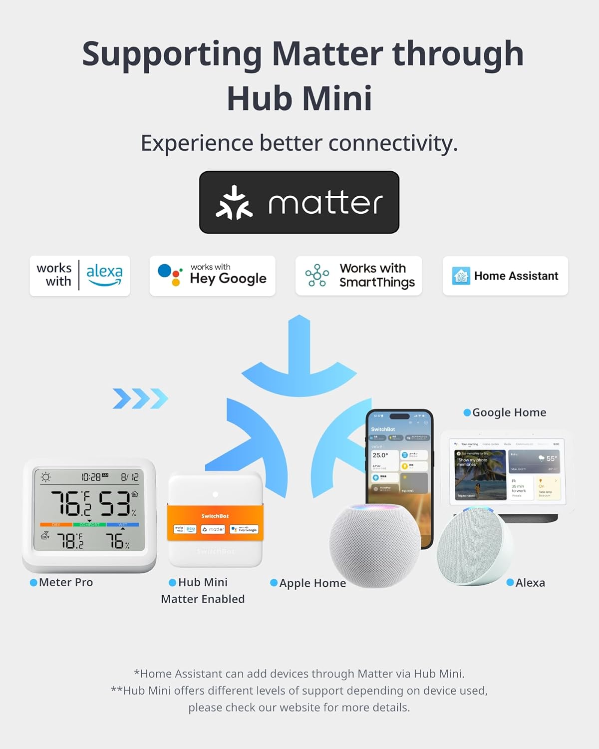 - Part of SwitchBot Ecosystem: When paired with SwitchBot Hub Mini or Evaporative Humidifier, you can control air conditioning and enable whole-house automation. With Hub Mini, you can also use voice commands to check temperature, humidity, and control your devices remotely.