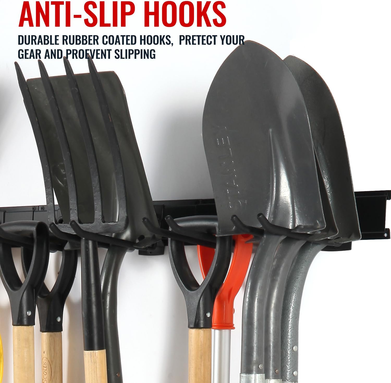 - PROTECTIVE ANTI-SLIP HOOKS: Rubber-coated garage wall hooks provide an anti-slip grip, protecting tools from scratches and falls, enhancing overall safety. These tool hooks for garage walls are designed to keep your tools secure and in place.