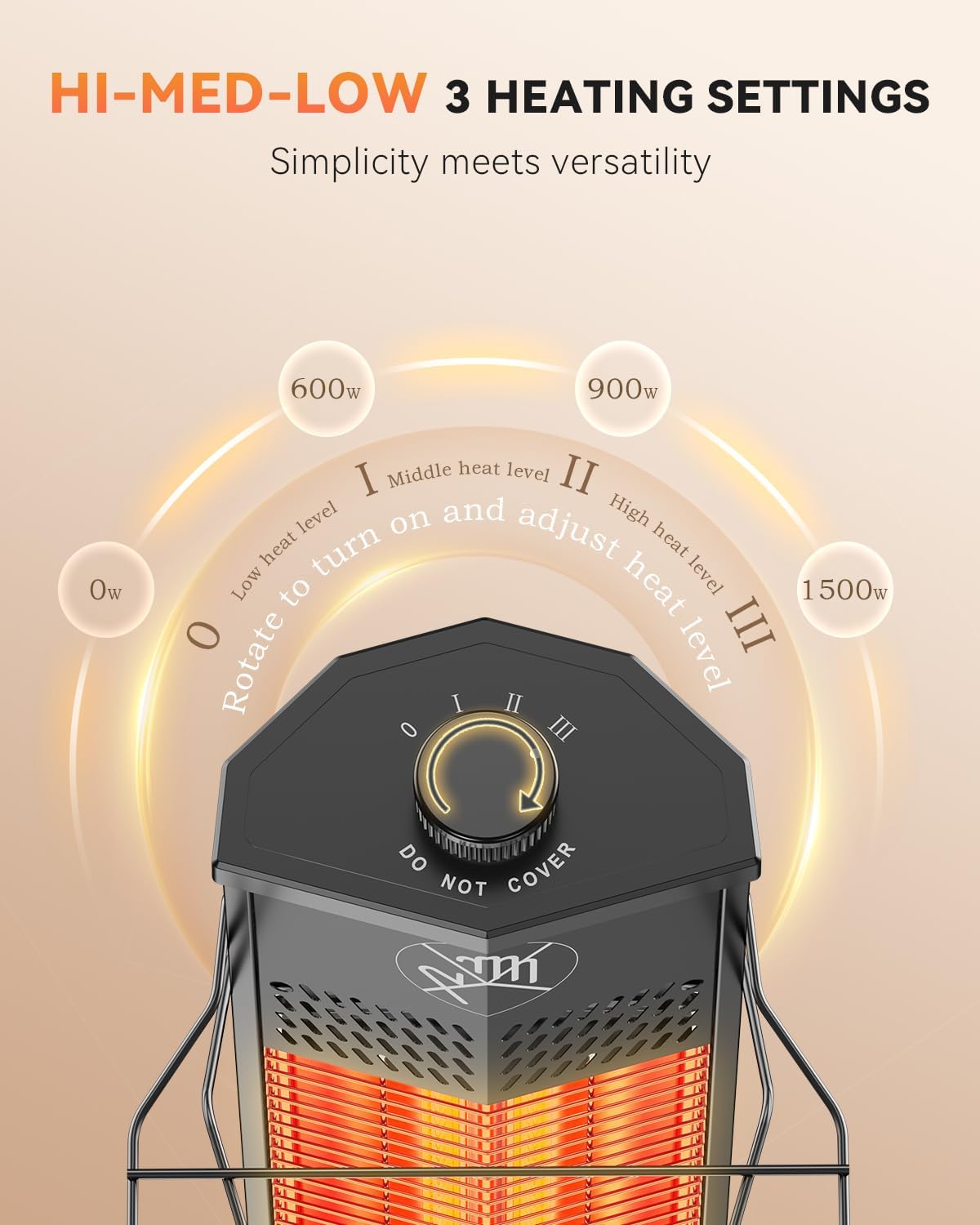 - 【3 Heat Settings】This electric space heater is suitable for both outdoor and indoor use. Equipped with 3 heating levels,600W/900W/1500W, perfectly customized to meet your desired temperature that makes you feel nice and warm in a cold environment.
