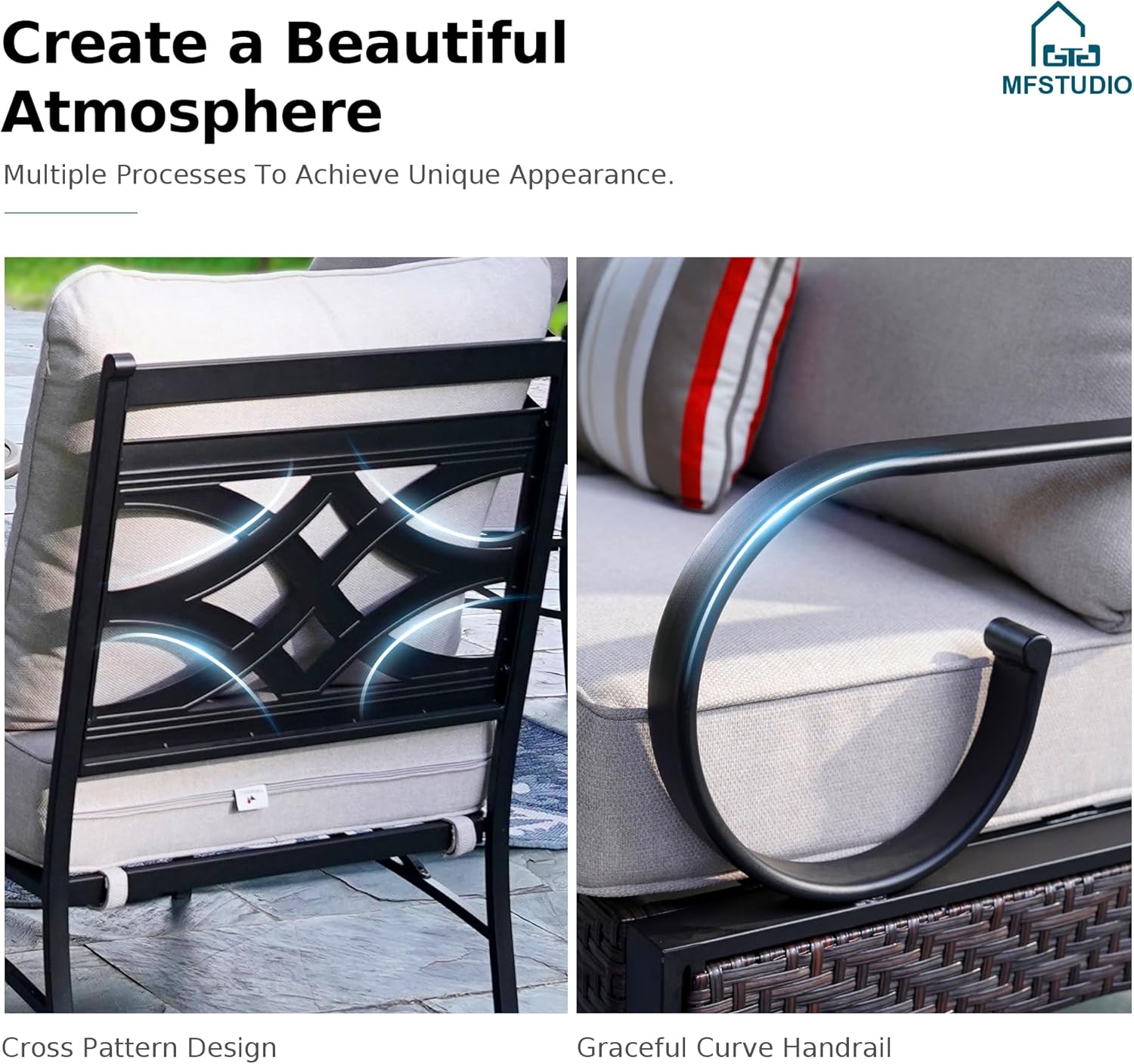 - Comfortable Cushions: MFSTUDIO 5.5" Thicker cushions have Cushion-Pro Technology, which have excellent water, oil and stain resistance. All the cushions are filled with high-density sponge. Each cushion cover features Velcro and zipper, which help secure the cushion in place to prevent slipping, and make the cover easy to remove and wash