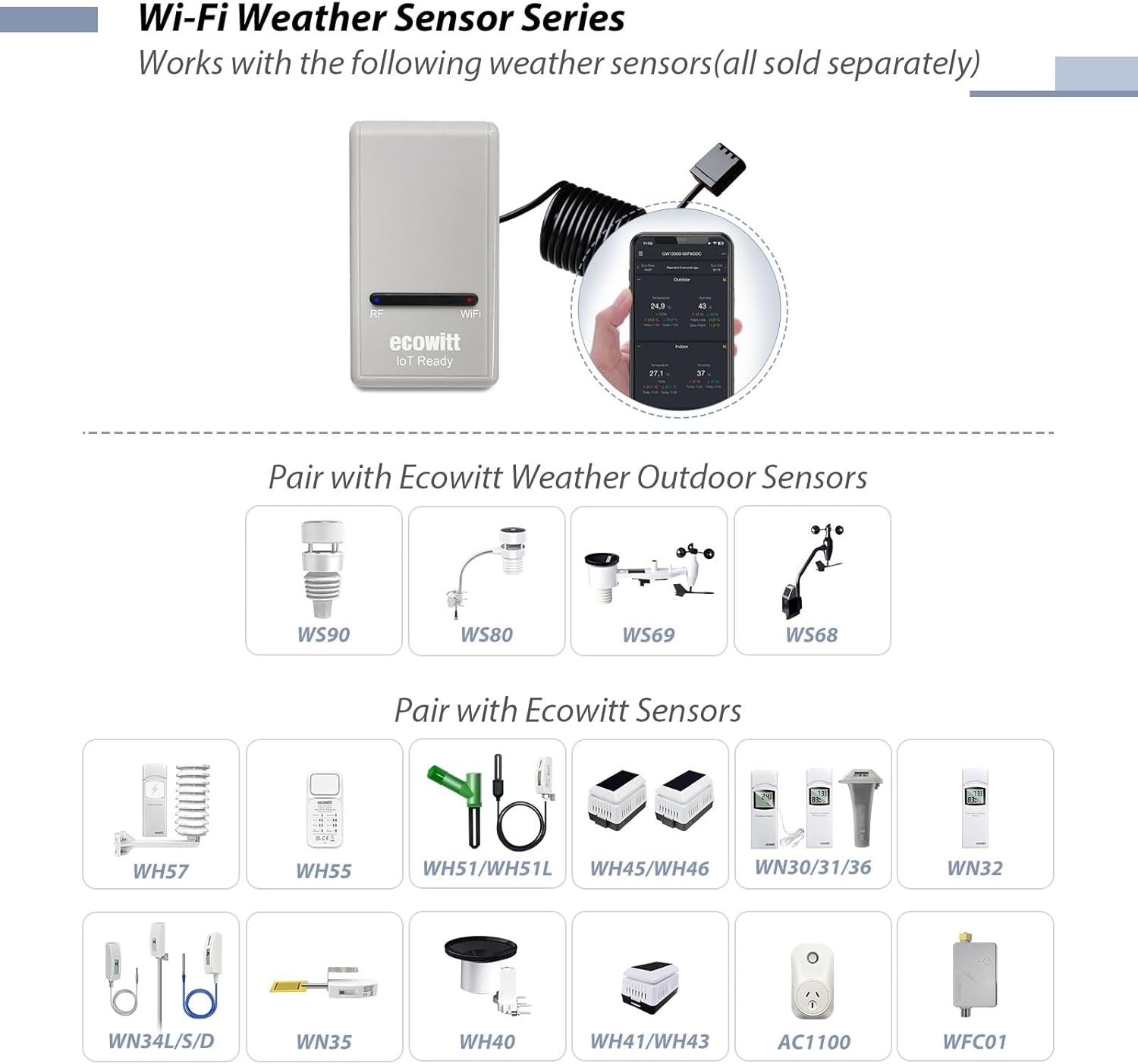 - 【2024 Latest Wi-Fi Gateway Weather Station】: With bulti-in temperature, humidity, and barometric pressure 3-in-1 sensor, the Ecowitt GW1200 Wi-Fi gateway could not only be an indoor weather station but also be a Wi-Fi gateway to connect to Ecowitt all developed sensors/subdevices. An additional 1.5m/3ft USB extension cable for powering the gateway, allowing you to measure more accurate values at any location.