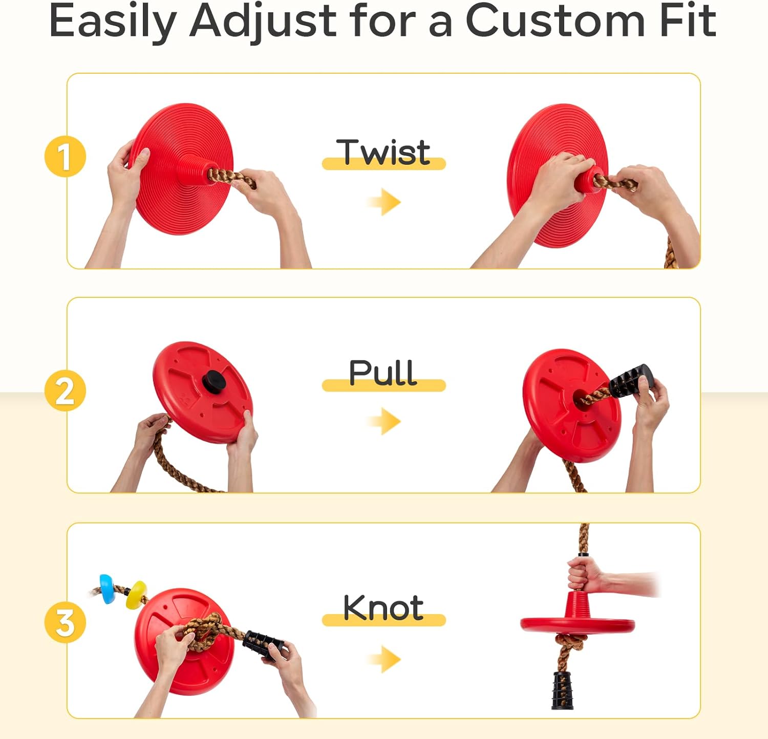 - ăAdjustable Fită Easily adjust the length from 4.6 ft to 6.5 ft by pulling the rope through the bottom and tying a knot; perfect for various setups and heights, making it ideal for growing kids and fun for the whole family