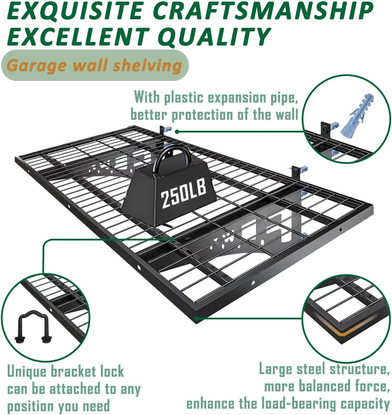 - UNIQUE DESIGN: The surface of the garage wall shelving is made of โhigh temperature powder coatingโ process, which makes the surface smoother and more durable, and the edges are also wrapped to avoid scratches.
