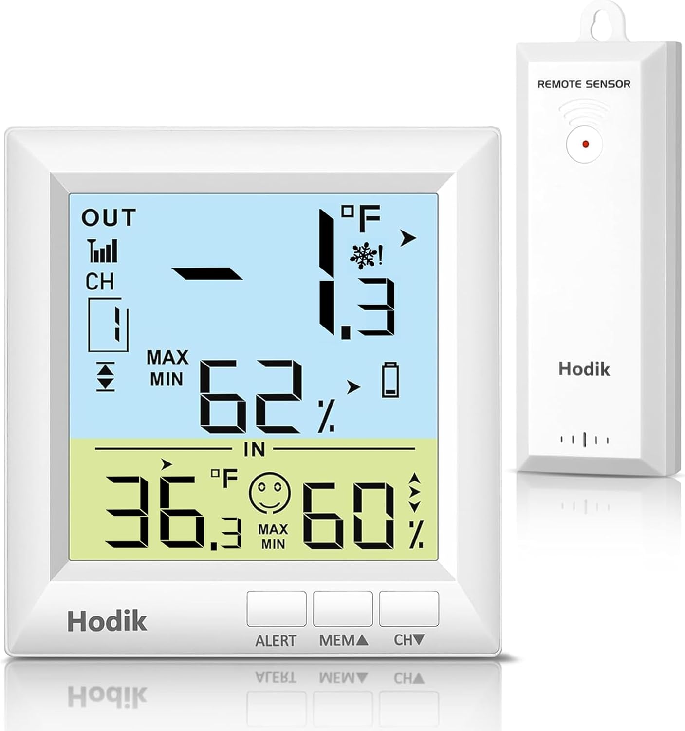 - ăPre-calibrated Sensoră: This digital refrigerator thermometer with alarm is smart and accurate, with a temperature accuracy of ±0.5°F and humidity of ±2%. Sensor temp range: -40 °F to 158°F; humidity range: 1% to 99%, perfect for refrigerator, also widely use for different occasions.