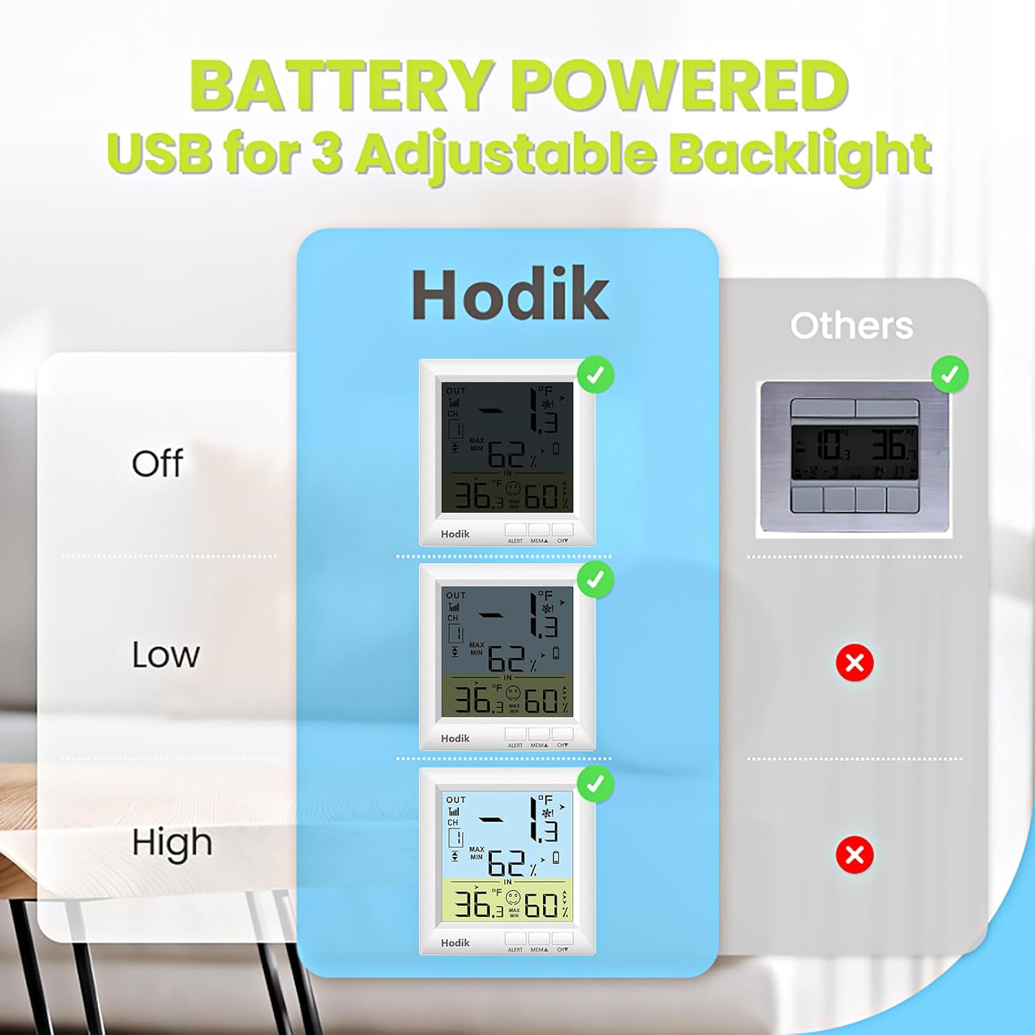- ăBattery Powered, USB for 3 Adjustable Backlightă: When powered by battery (not included), you can read the wireless freezer thermometer at day, the screen lights up in color when you touch backlight button and goes off after 10s. With attached USB cable for full functional screen, including constant backlight and adjustable settings (high-low-off).