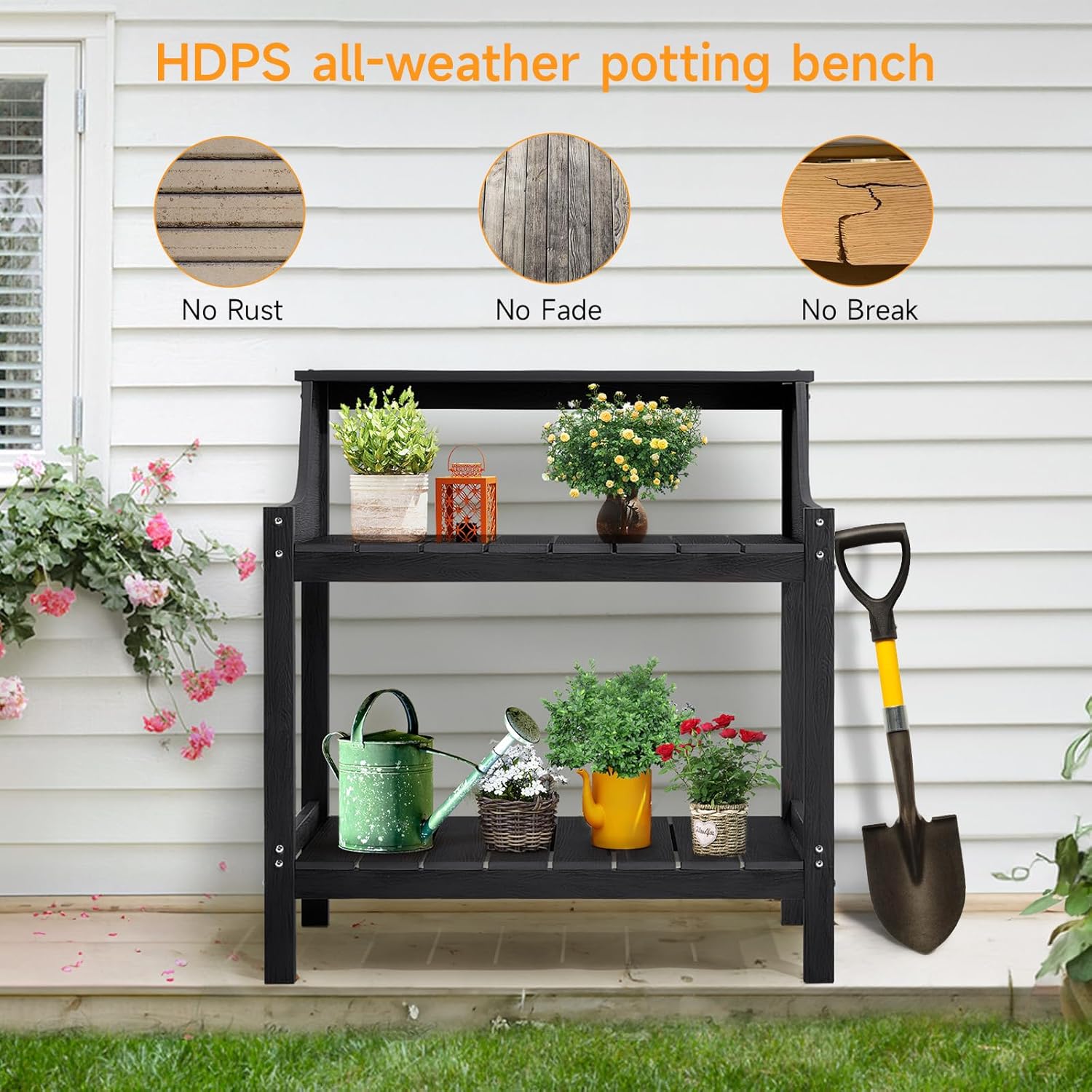 Potting Bench Table, HDPS Potting Bench with 4 Side Hooks, All-Weather Garden Table Work Station, Outdoor Potting Table for Porch, No Rust, No Fade, No Break, 360lbs Capacity (Black, Large)