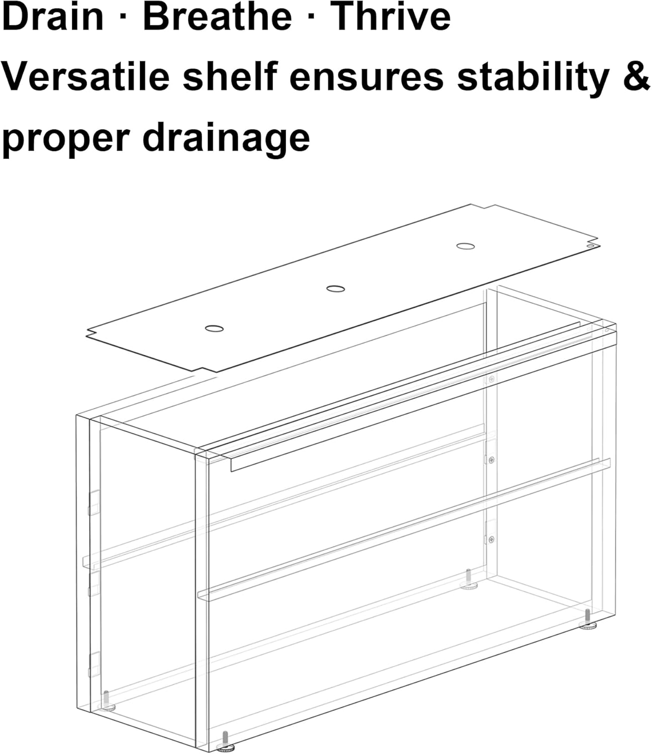 - Built-In Shelf with 3 Drainage Holes & Four Stable Legs for Airflow and Surface Protection The internal shelf efficiently drains excess water to prevent root rot, while four sturdy legs elevate the planter to improve ventilation and protect floors or furniture.