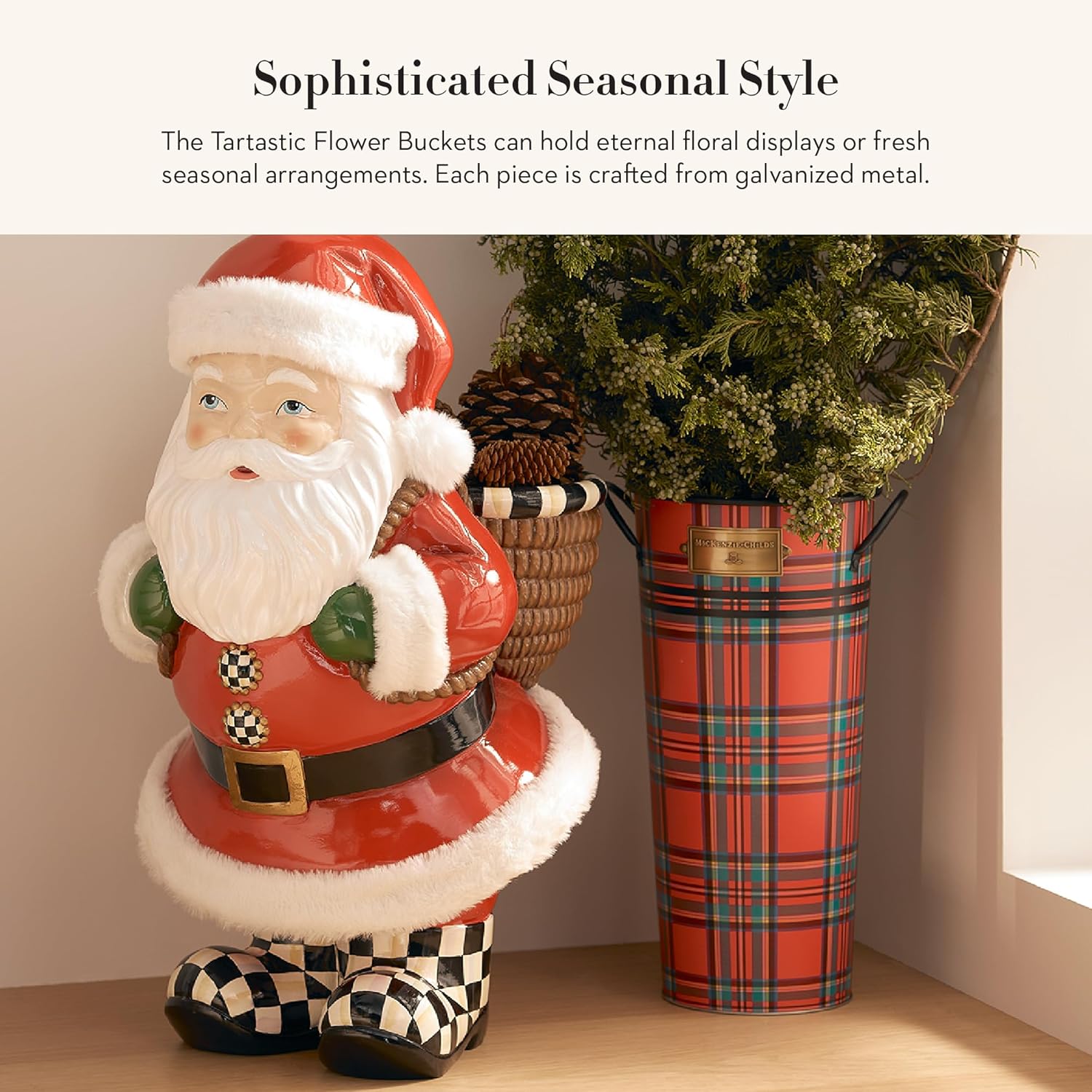 MACKENZIE-CHILDS Galvanized Flower Buckets, Decorative Metal Buckets, Tartastic, Set of 3