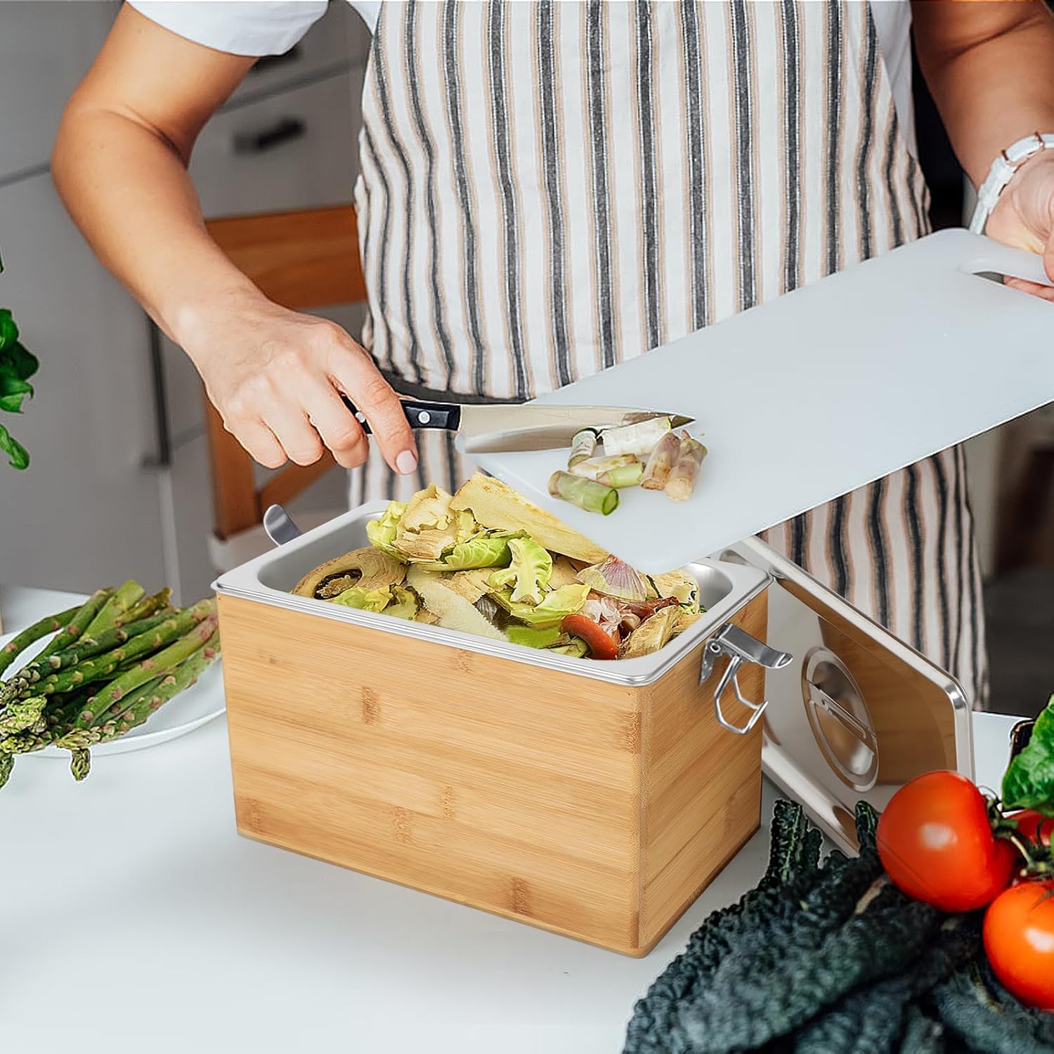 - 【Wide Application】This indoor compost bin is simple and generous appearance, suitable for any kitchen countertop, you can also place it in any location you need to use, suitable for cabinets, kitchen, living room and so on. The space-saving and environmentally friendly indoor compost bin is not only a simple alternative to a compost bin, but also a unique decorative piece