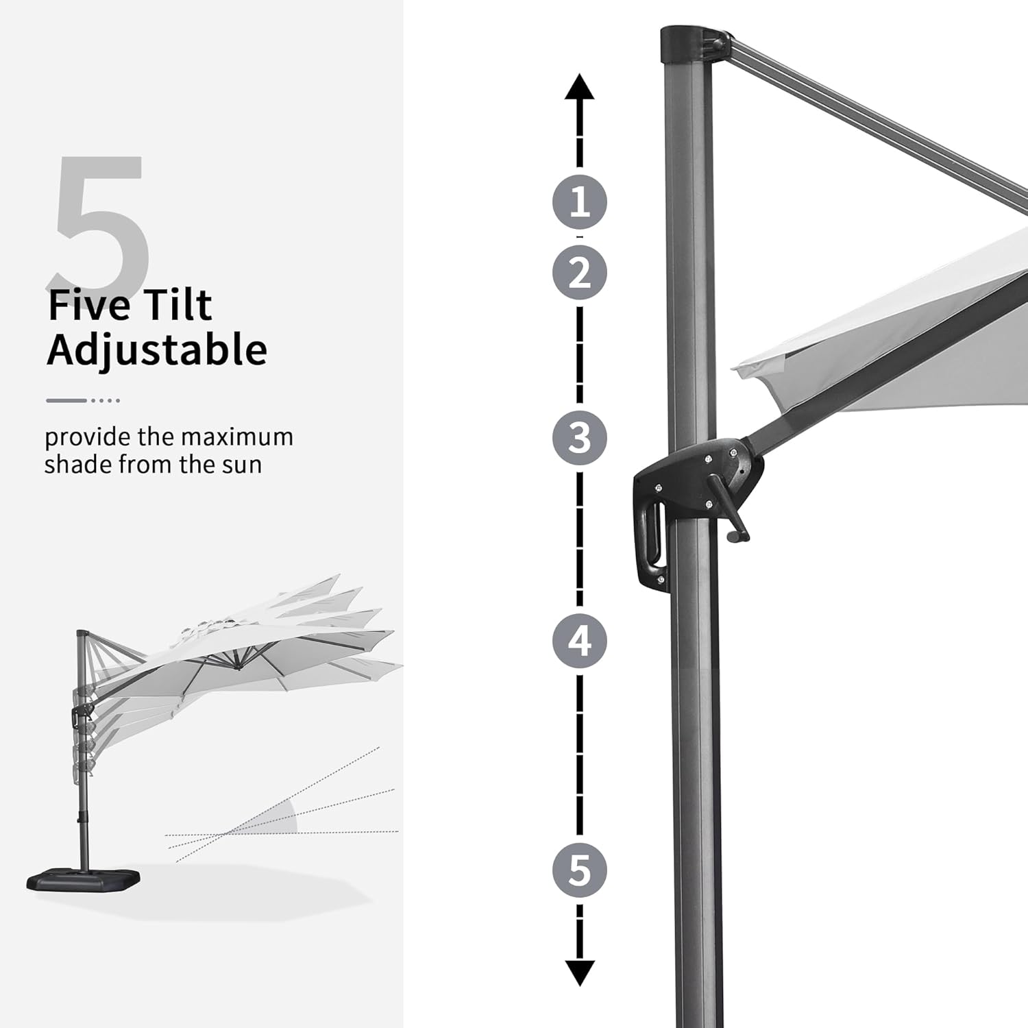 - The crank system of this cantilever umbrella makes it easy to raise and lower the canopy, the unique handle design also makes tilting the umbrella effortless, foot pedal allows for complete 360 degree rotation
