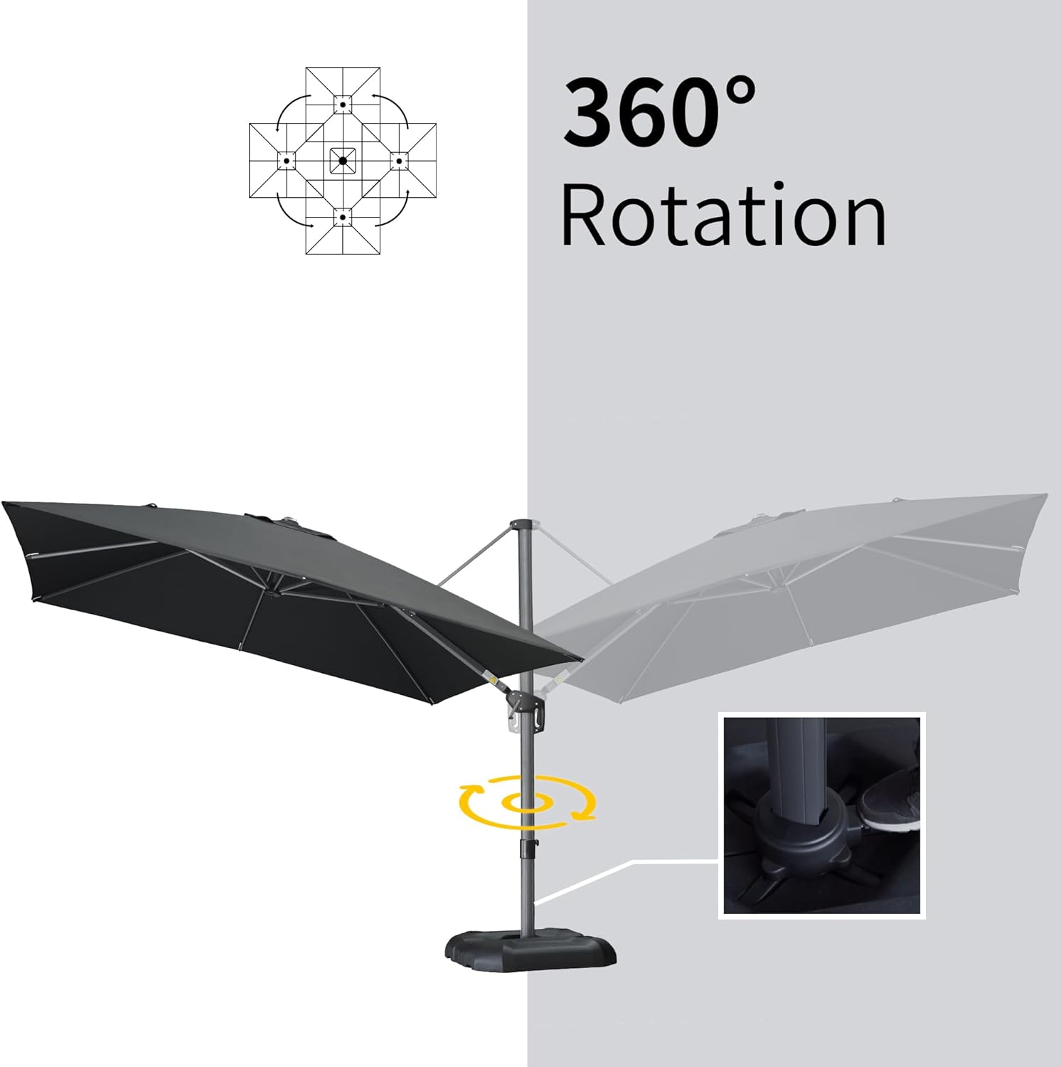 - The crank system of this cantilever umbrella makes it easy to raise and lower the canopy, the unique handle design also makes tilting the umbrella effortless, foot pedal allows for complete 360 degree rotation