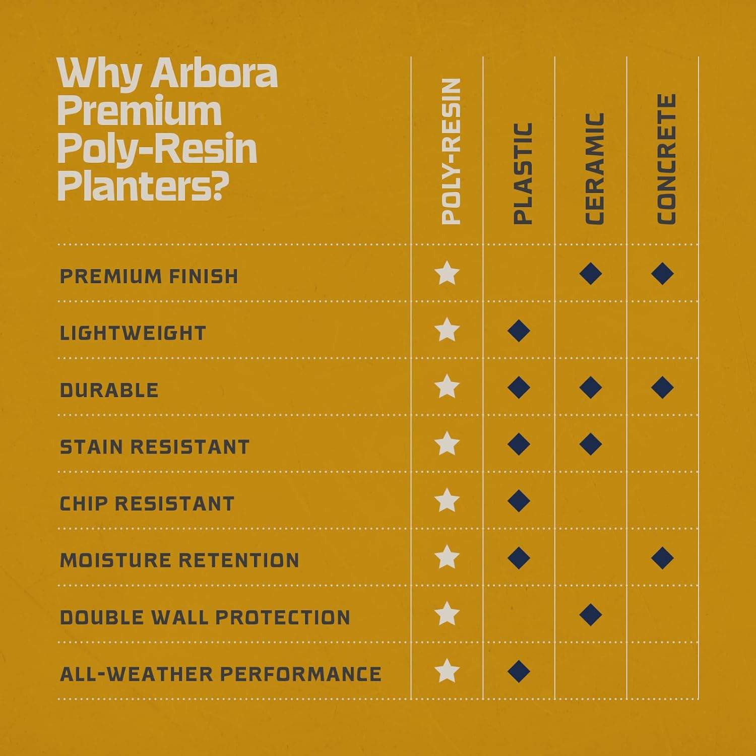 - Weatherproof & Durable - Constructed with resilient resin, Arbora pots are weatherproof and fade-resistant, maintaining their integrity season after season. Featuring double-walled insulation, experience superior plant protection in any weather.