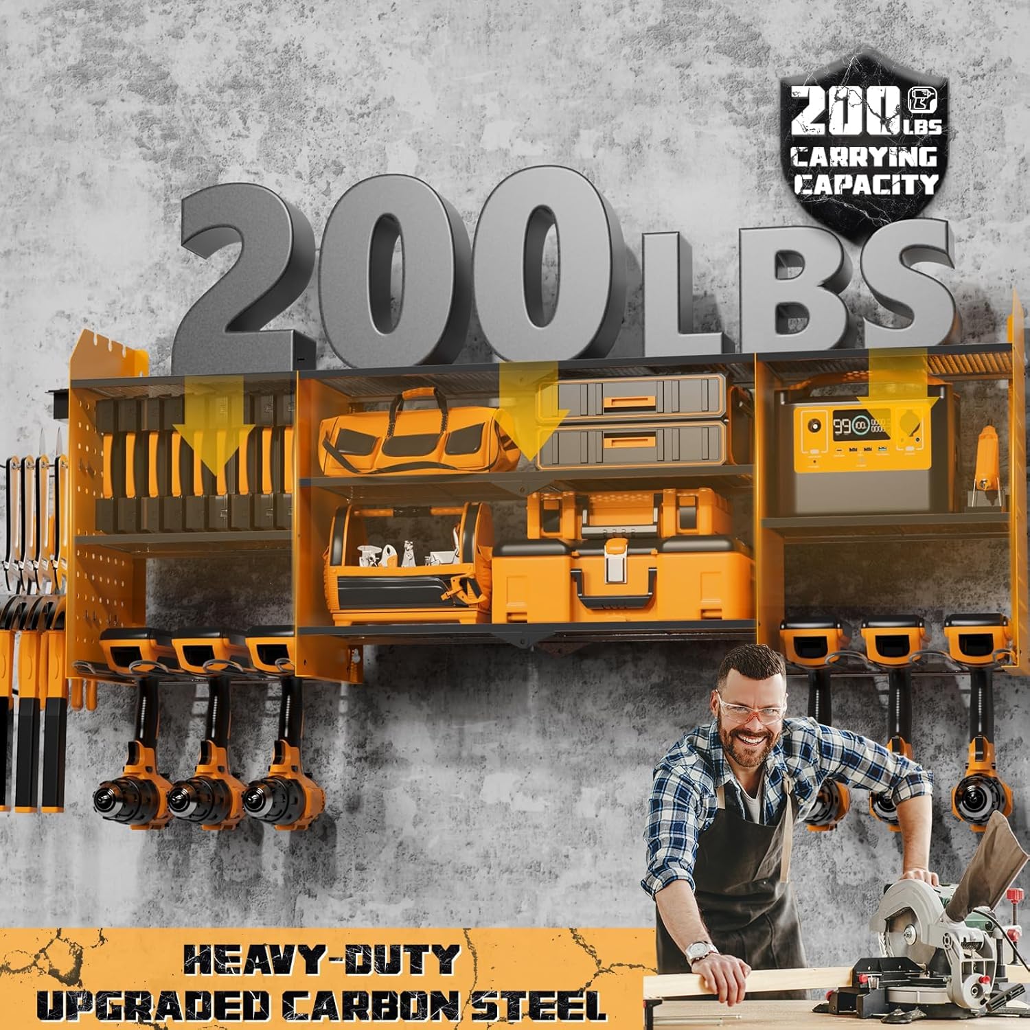 - Stable Structure with High Load Capacity: Made from heavy-duty upgraded carbon steel, this wall-mounted tool organizer is strong, stable, and resistant to deformation, supporting up to 200 lbs (40 lbs per shelf). It features easy assembly with included Phillips screws and screwdriver for a hassle-free installation