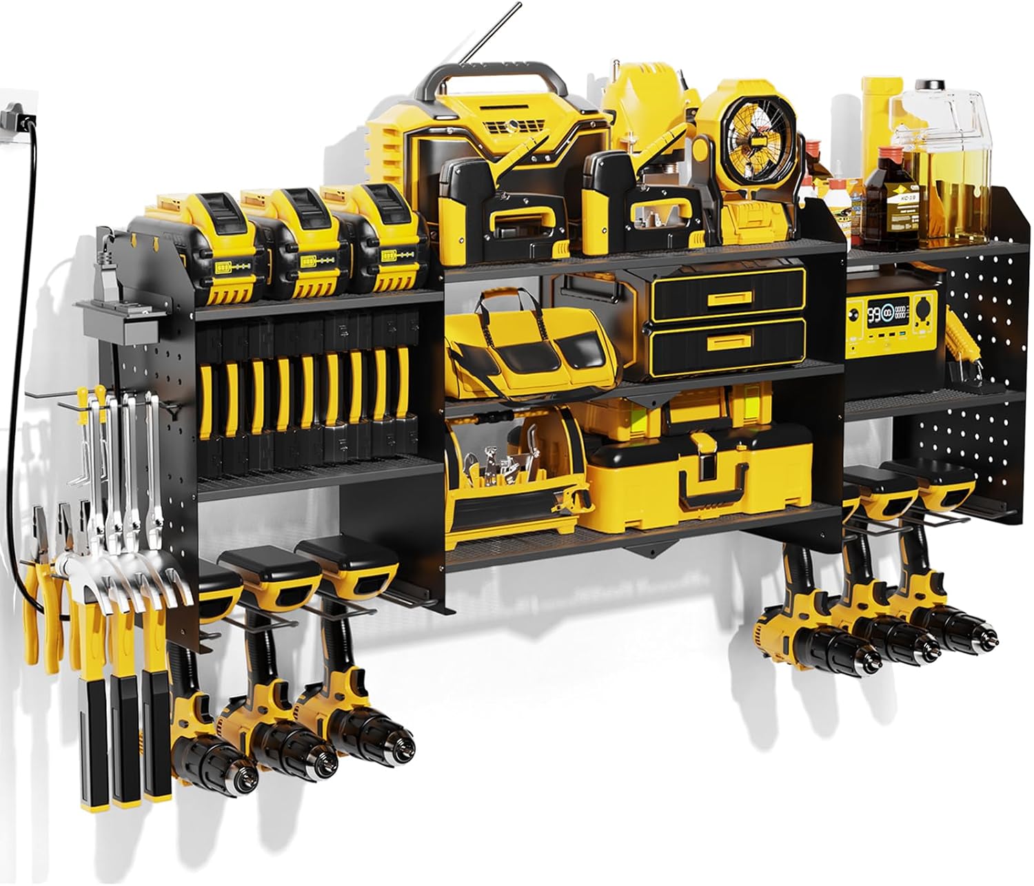 - Power Tool Organizer with Charging Station: Position outlets on either side to keep your tools charged. The American-standard power strip (Output: 125V/12A/1500W) provides device protection, frees up top-shelf space, and clearly displays power status. Includes a 6.56 ft power cord for easy setup