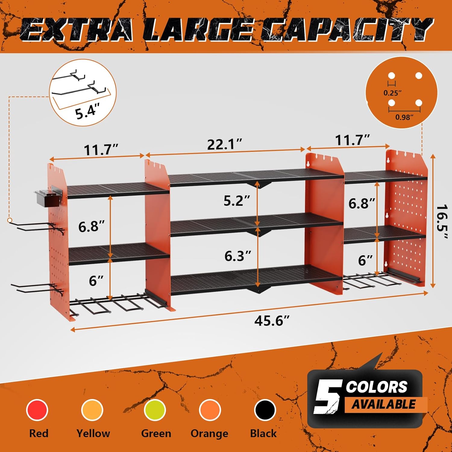 - Versatile Garage Storage Rack: The top shelf holds heavy-duty tools like electric and miter saws, while the middle and lower shelves fit medium-sized items like chargers, batteries, and toolboxes. The 5.4-inch side pegboard hooks keep hammers and screwdrivers organized and accessible. This wall-mounted garage organization saves floor space, transforming a cluttered area into an organized workspace. Note: Tools shown are for display only and are not included