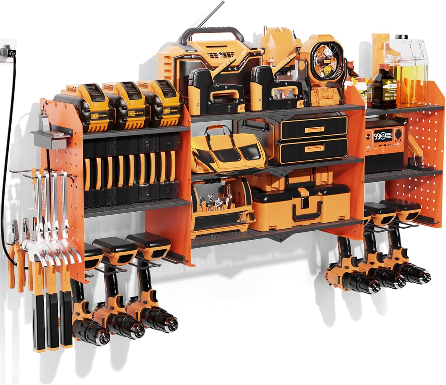 - Power Tool Organizer with Charging Station: Position outlets on either side to keep your tools charged. The American-standard power strip (Output: 125V/12A/1500W) provides device protection, frees up top-shelf space, and clearly displays power status. Includes a 6.56 ft power cord for easy setup