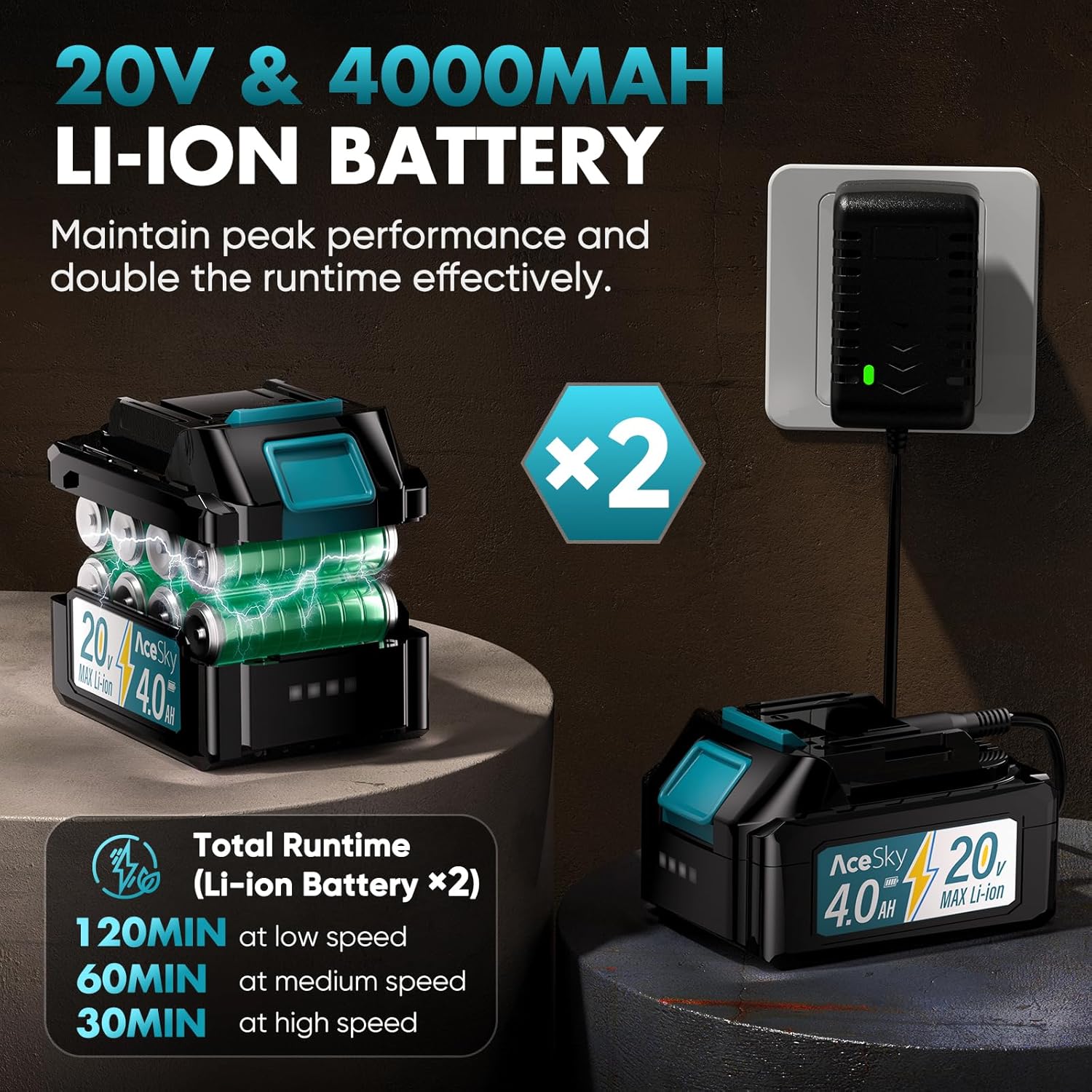 - 🔋【2*4.0AH & 20V Lithium Batteries】Our cordless leaf blower is equipped with Dual 4.0AH lithium batteries, providing up to 120 minutes of runtime in low-speed mode and 30 minutes in high-speed mode. A convenient battery indicator (25%-50%-75%-100%) lets you monitor remaining power and charging progress with ease. Plus, the built-in protection system automatically shuts off the motor and battery, extending their lifespan and ensuring safe,continuous performance for all your outdoor cleaning needs