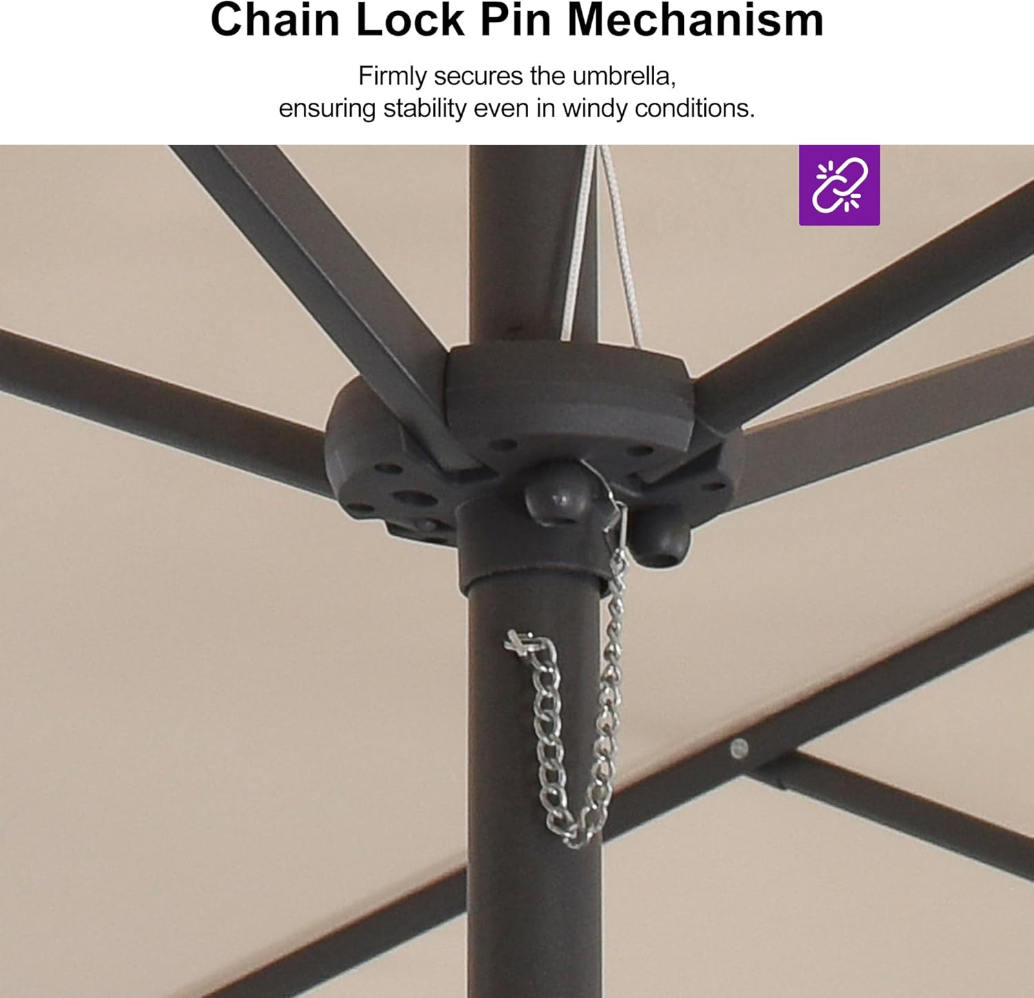 - Crank Design: The simple crank lifting system is equipped, enabling the convenient and rapid opening and closing of the patio umbrella. Additionally, an advanced chain lock pin is provided, ensuring the stability of the umbrella even in windy conditions