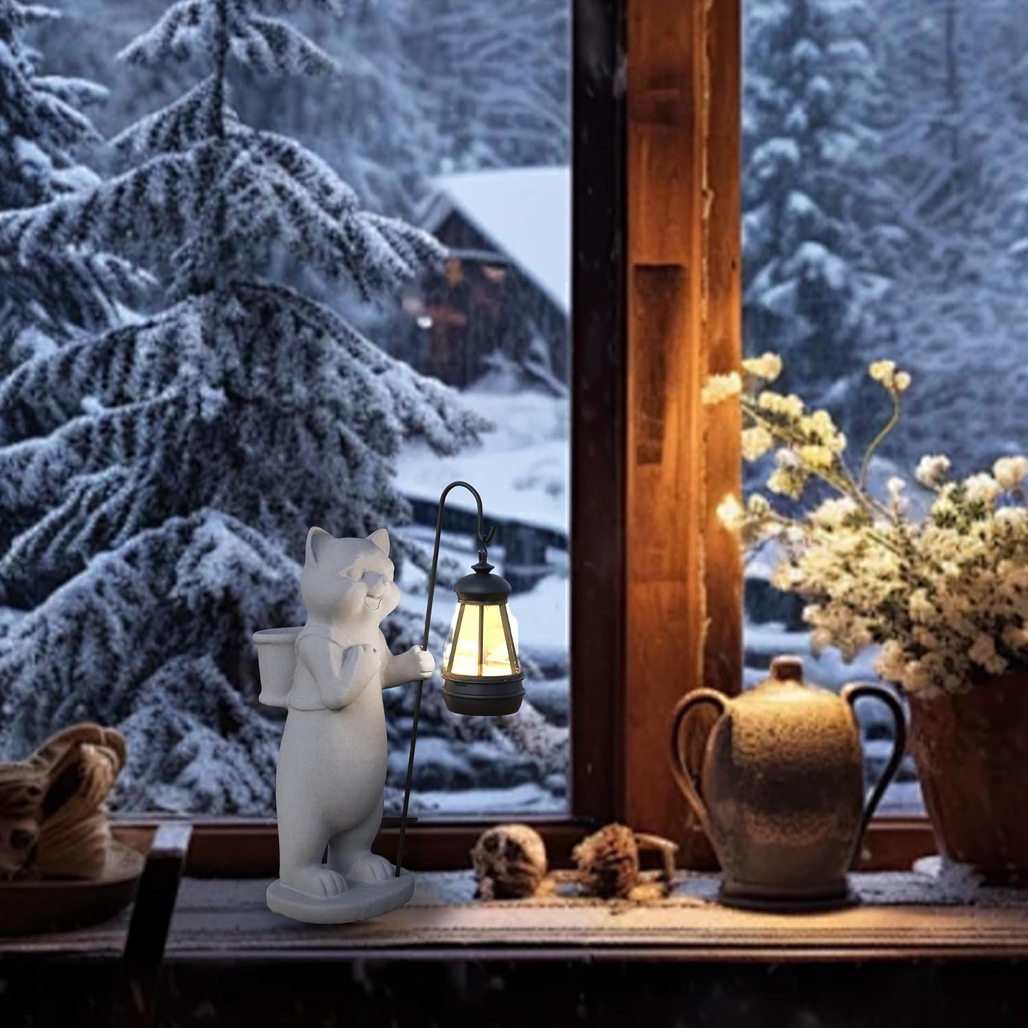 Garden Decoration, Figurine, Lawn Statue, Sculpture Ornament, Animal Figurine - Cat Resin Statue with Lantern (Basket)