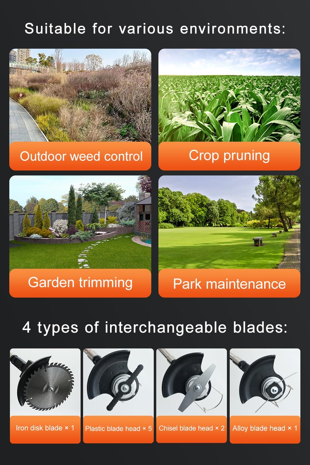 - 【Deluxe Accessories 】Included accessories for the cordless weed wacker are: 1x lawn mower unit, 1x circular saw blade, 5x plastic blades, 2x chisel blades, 1x grass cutting head, 2x large-capacity batteries, 1x charger, gloves,a front handle, 2x wrenches, and an English user manual.